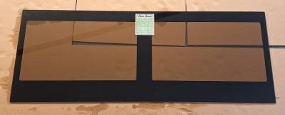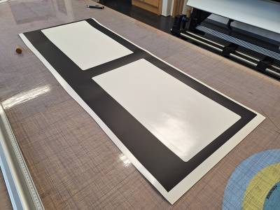 Um die neuen Monitore besser mit dem Rave Racer in Einklang zu bringen, nimmt eine Maske auf der Frontscheibe die Form der Monitore auf. Dafür wurde zunächst eine Vorlage aus Pappe gebaut um die Wirkung besser abzuschätzen. Im Anschluss wurden in Adobe Illustrator die genauen Maße übertragen um die Maske aus einer schwarzen Folie zu plotten. Diese Folie wurde mit einem Rakel auf das Glas übertragen. Danach konnte das fertige Glas wieder eingesetzt werden.