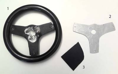 Aufgrund der starken Beschädigungen am rechten Lenkrad war es notwendig das Mittelstück nachzubauen. Dafür wurde die Form des Orginalstücks übernommen und aus einer Aluminiumplatte gesägt. Die Oberfläche sowie die Kanten wurden abgeschliffen. Um der Orginal-Lackierung so nah wie möglich zu kommen wurde eine Materialprobe schwarz lackiert. 1. Orginallenkrad