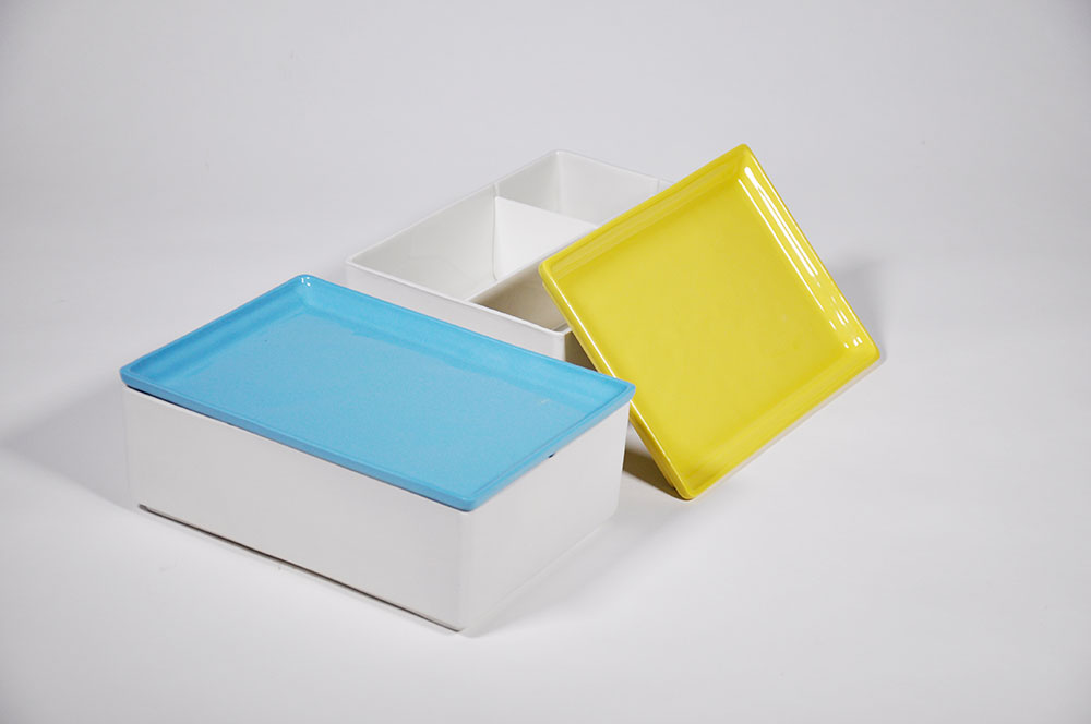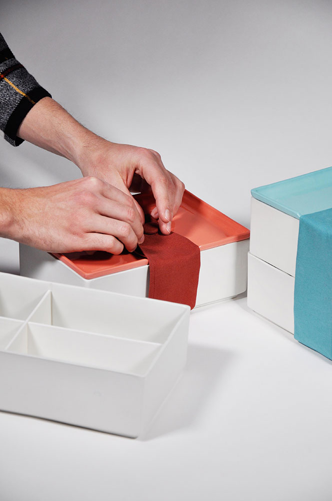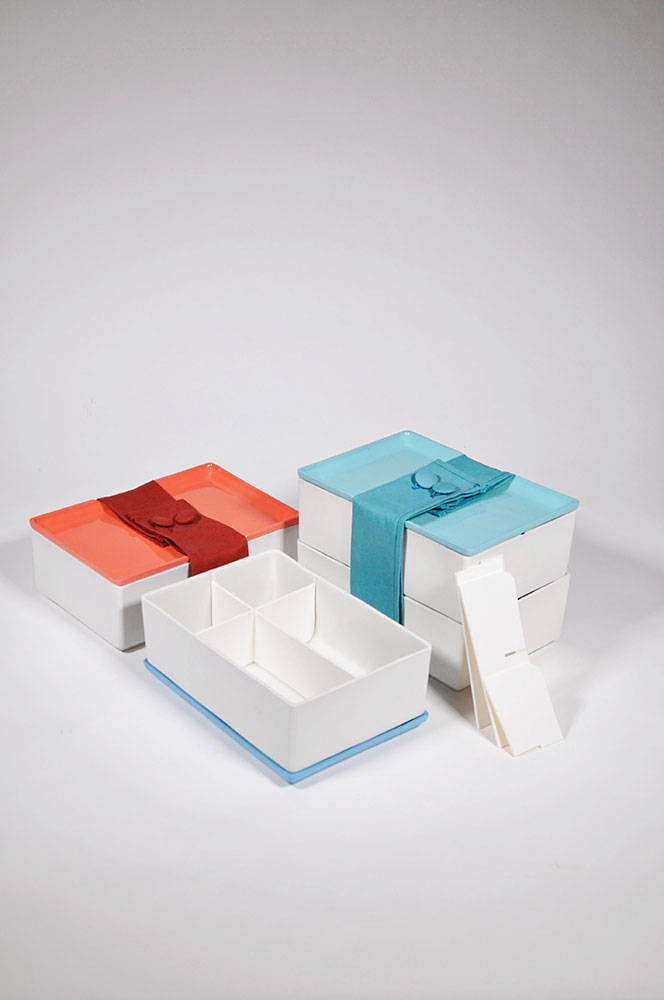 Die mit einem Geschirrstoff umspannte Porzellanbox findet ihren Platz im Catering-Service, dem Hotelrestaurant sowie auch im Privathaushalt. Mittels modular einsetzbaren Trennwänden lassen sich verschiedene Mahlzeiten und Lebensmittel in einem Objekt lagern und transportieren, ohne sich dabei zu vermischen. Für Buffets oder dem Catering-Service können somit Mahlzeiten vorbereitet und ausgegeben werden, ohne die Wertigkeit eines Porzellangeschirrs einbüßen zu müssen. Kombiniert wird die Box mit einem Deckel, welcher auch als Teller fungiert und mittels verschiedenen Farbvarianten die Essenskennzeichnung in der Gastronomie erleichtert. Ein zuknöpfbares Stofftuch sorgt zum einen für ein sicheres Verschließen und kann zusätzlich vom Benutzer als Serviette verwendet werden. Bentō go ist stapelbar, geschirrspüllfest, reproduzierbar und nicht geruchsanfällig.