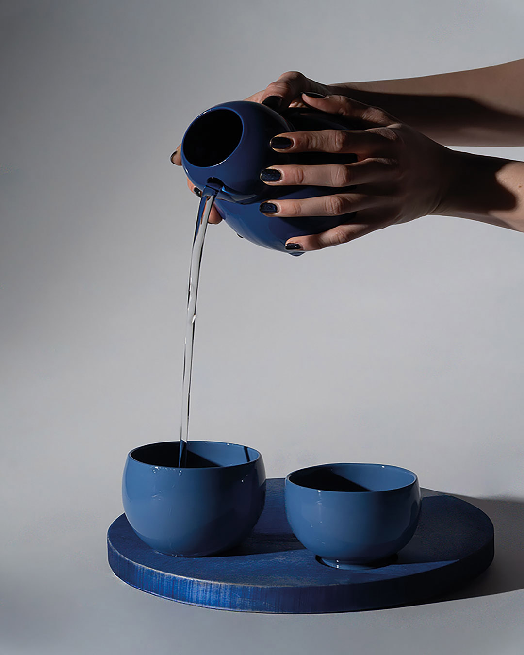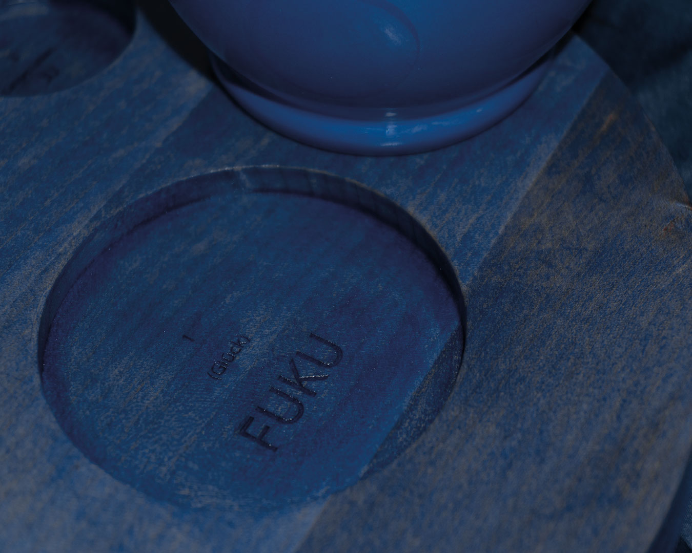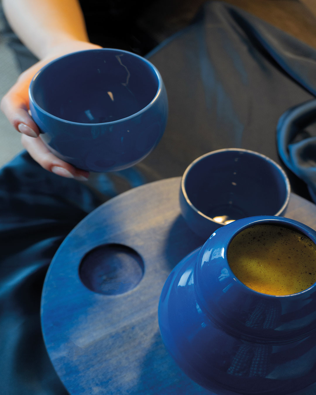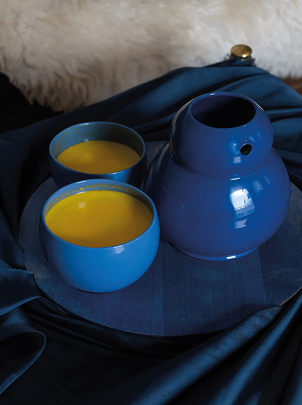 Nach einer anstrengenden und kalten, winterlich werdenden Woche setzen wir uns zu zweit gemütlich an den Couchtisch. Mein Gast findet entspannt seinen Lieblingsplatz, ob auf der Couch oder dem Teppich. Kerzen flackern sanft, Sandelholzduft erfüllt den Raum – eine stille Ruhe breitet sich aus. Ich öffne das Gespräch, während ich in der Küche eine wärmende Goldene Milch vorbereite: Mandelmilch mit frisch geriebenem Kurkuma und Ingwer, verfeinert mit Pfeffer, Zimt, Muskat, Kokosöl und Honig. Jede Bewegung geschieht achtsam, jede Zutat ein Akt der Fürsorge. Die Milch fließt in eine bauchige kobaltblaue Karaffe, begleitet von einer kleinen und großen hellblauen Tasse auf einem blau schimmernden Ahornholztablett – wie ein Nistpüppchen, jedes Gefäß mit eigenem Namen. Vorsichtig trage ich das Set zum Tisch, umschmiege die Karaffe Fuku (Glück) und schenke in Rokku (Wohlstand). Für mich gieße ich in Ju (Langes Leben). Wir stoßen an, das goldene Elixier reflektiert das Kerzenlicht, jeder Schluck wird zum rituellen Moment der Nähe, Wärme und Zuneigung. Leise, kostbar und bewusst dehnt sich dieser Augenblick aus – ein Zeichen von Gastfreundschaft, Vertrauen und Intimität, das in der Stille mitschwingt, inspiriert von der japanischen Teeservice-Tradition Omotenashi, bei der jede Handlung Achtsamkeit und respektvolle Aufmerksamkeit für den Gast ausdrückt.