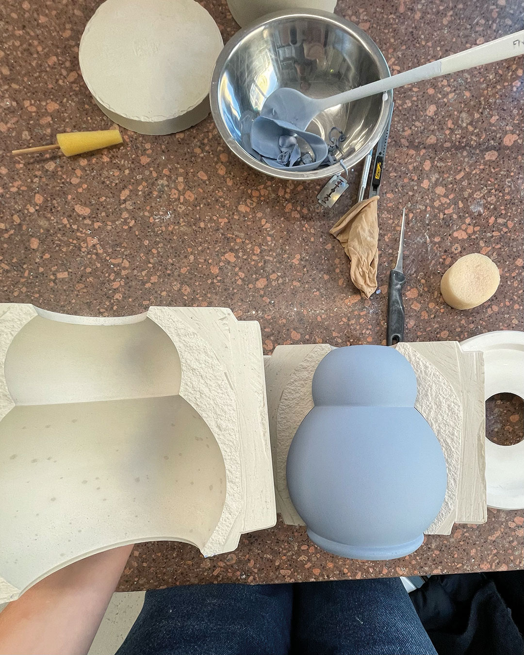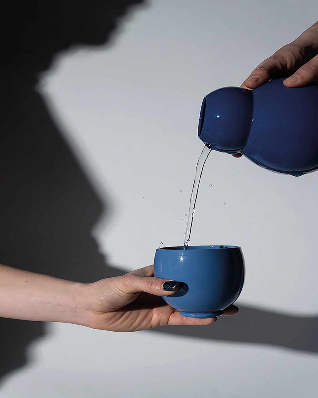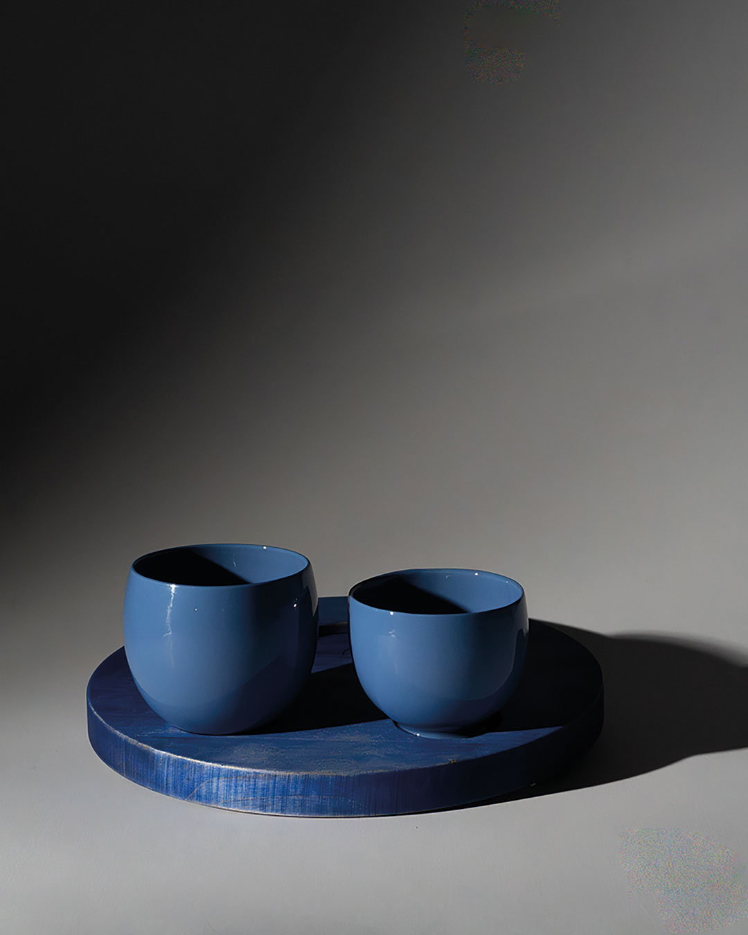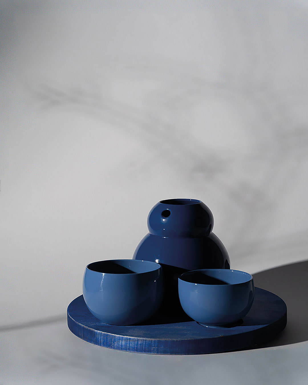 Nach einer anstrengenden und kalten, winterlich werdenden Woche setzen wir uns zu zweit gemütlich an den Couchtisch. Mein Gast findet entspannt seinen Lieblingsplatz, ob auf der Couch oder dem Teppich. Kerzen flackern sanft, Sandelholzduft erfüllt den Raum – eine stille Ruhe breitet sich aus. Ich öffne das Gespräch, während ich in der Küche eine wärmende Goldene Milch vorbereite: Mandelmilch mit frisch geriebenem Kurkuma und Ingwer, verfeinert mit Pfeffer, Zimt, Muskat, Kokosöl und Honig. Jede Bewegung geschieht achtsam, jede Zutat ein Akt der Fürsorge. Die Milch fließt in eine bauchige kobaltblaue Karaffe, begleitet von einer kleinen und großen hellblauen Tasse auf einem blau schimmernden Ahornholztablett – wie ein Nistpüppchen, jedes Gefäß mit eigenem Namen. Vorsichtig trage ich das Set zum Tisch, umschmiege die Karaffe Fuku (Glück) und schenke in Rokku (Wohlstand). Für mich gieße ich in Ju (Langes Leben). Wir stoßen an, das goldene Elixier reflektiert das Kerzenlicht, jeder Schluck wird zum rituellen Moment der Nähe, Wärme und Zuneigung. Leise, kostbar und bewusst dehnt sich dieser Augenblick aus – ein Zeichen von Gastfreundschaft, Vertrauen und Intimität, das in der Stille mitschwingt, inspiriert von der japanischen Teeservice-Tradition Omotenashi, bei der jede Handlung Achtsamkeit und respektvolle Aufmerksamkeit für den Gast ausdrückt.