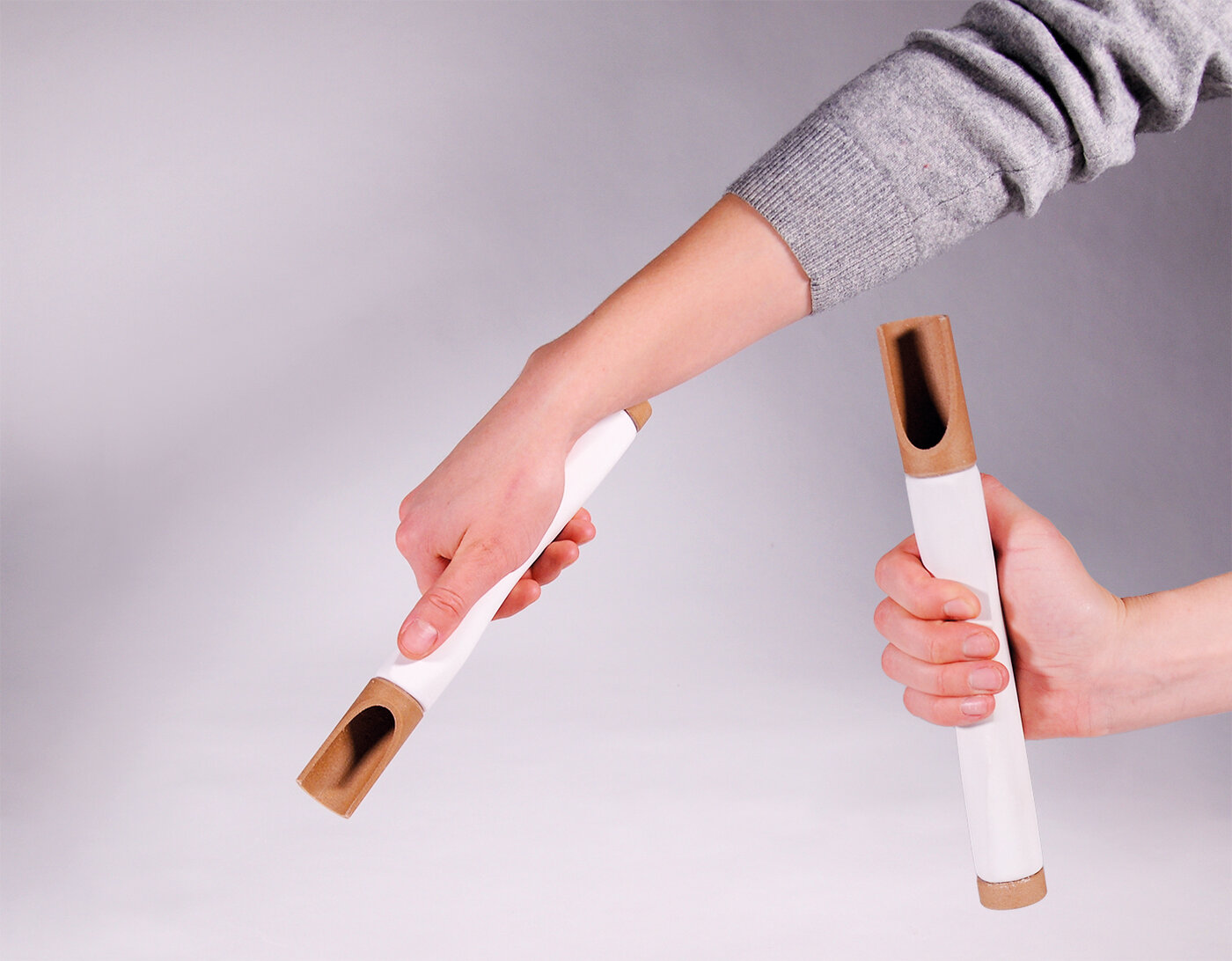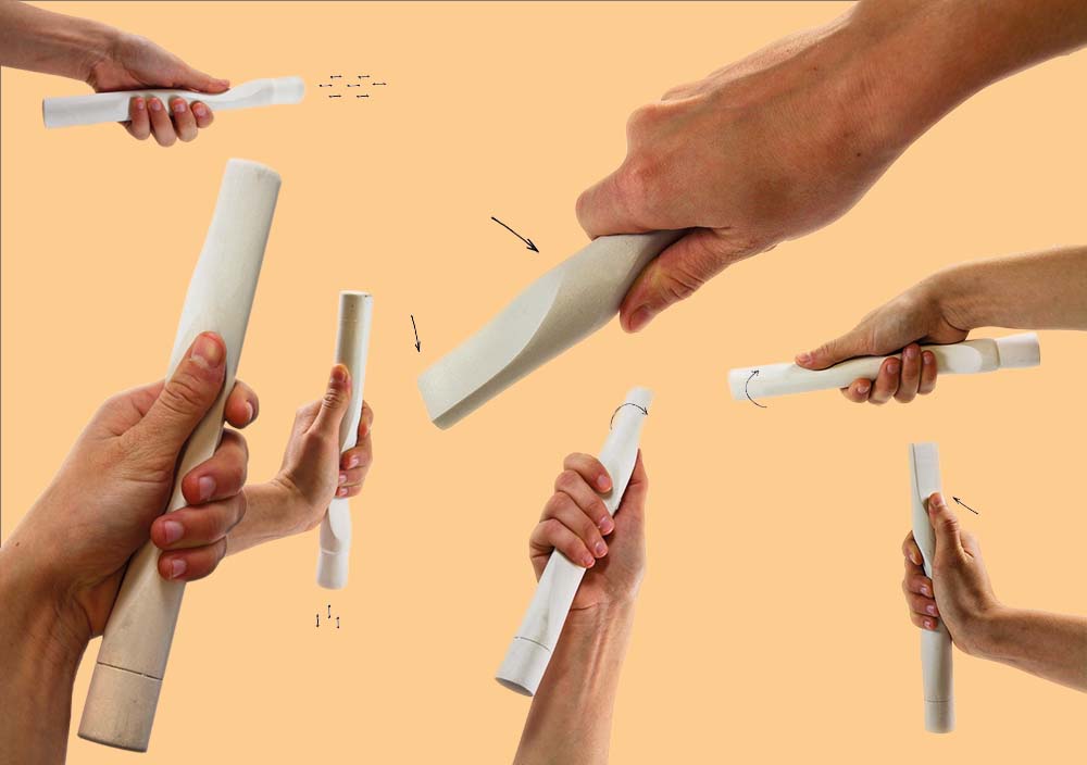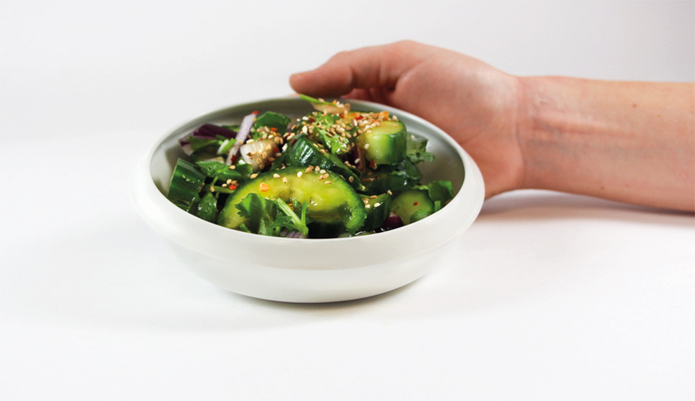 Das aus Porzellan und Bambusholz gefertigte Salatbesteck PoCu hilft bei der Zubereitung. Durch die prägnant geschwungene Kante an dem aus Porzellan gegossenen Mittelteil, wird die Grifffläche angedeutet und es ergeben sich verschiedene Möglichkeiten des Greifens. Der Stampfer aus Bambusholz wird genutzt, um die Gurkenstücke auf traditionelle Art zu zerstoßen. Greift man um, lassen sich Gurke und Dressing mit Hilfe der Laffe vermengen. Diese ist aus Bambusrohr geschnitzt und dient durch ihre schmale und längliche Form auch dem präzisen Portionieren in die Servierschalen des Sets.