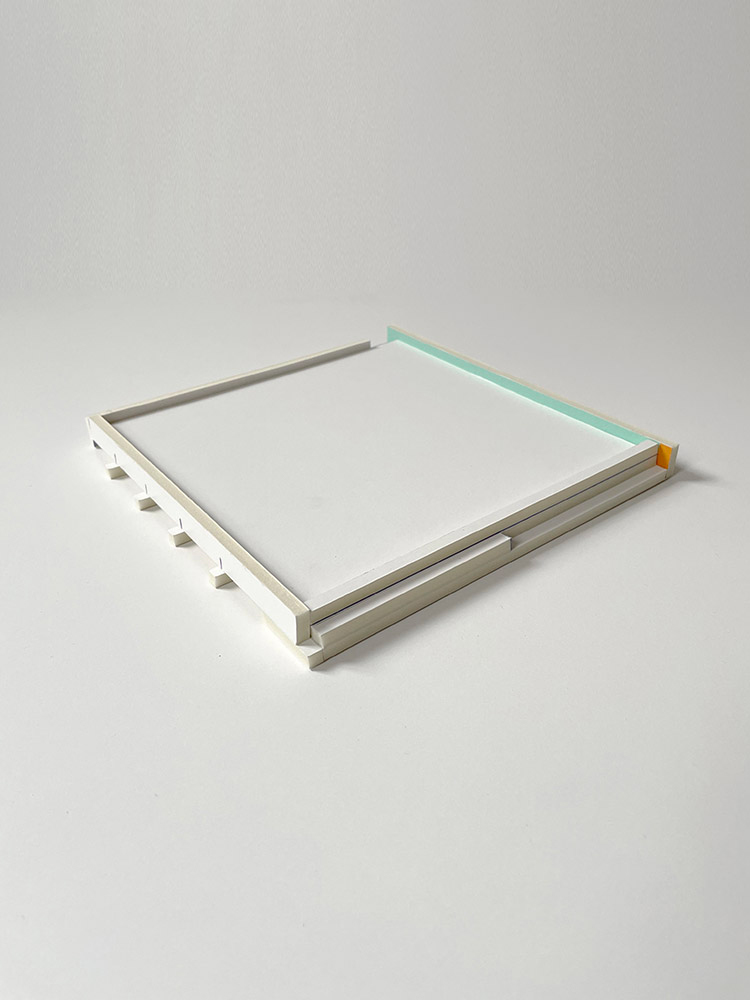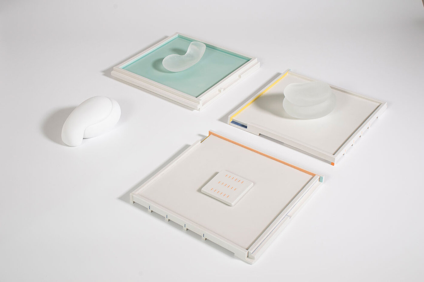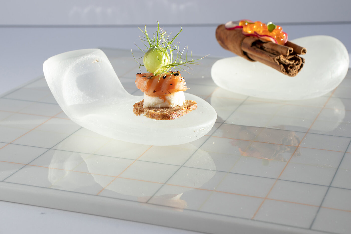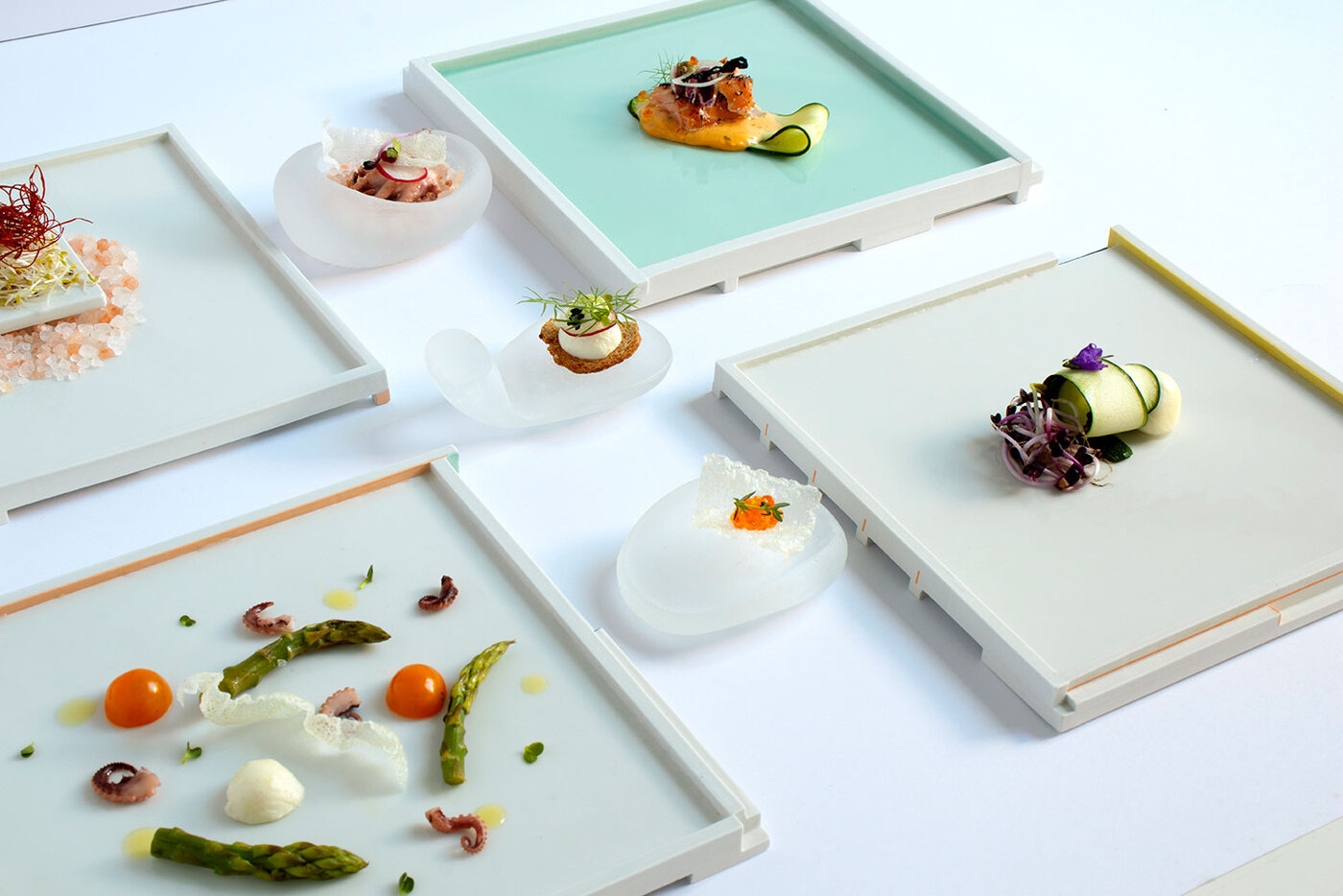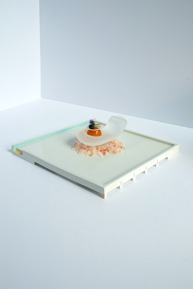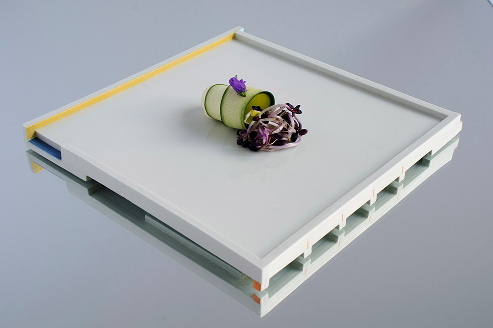 Ziel dieses Entwurfs ist es, die beiden sehr unterschiedlichen Konzepte von geometrischen Tellern und einem organischen Container zu kombinieren, sodass die beiden Objekte in der Verschmelzung als abstraktes Kunstwerk eine Komposition hervorbringen. Dieser Kontrast dient der Inszenierung einer Abfolge von maßvoll portionieren Gerichten. Ein originelles Zusammenspiel von Formen und Farben, welche die Augen bezirzen und die Fantasie anregen, bevor sie die Lippen verführen.