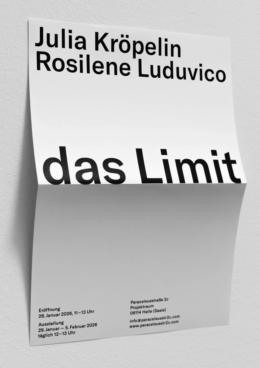 Das Limit ist eine gemeinsame Ausstellung von Julia Kröpelin, Professorin für Bildnerische Grundlagen/Zeichnung, und Rosilene Luduvico, Vertretungsprofessorin für Bildnerische Grundlagen/Malerei an der Burg Giebichenstein Kunsthochschule Halle. Die Ausstellung wurde eigens für den Raum in der Paracelsusstraße 2C in Halle (Saale) entwickelt und nimmt Bezug auf dessen räumliche Situation. Gezeigt werden aktuelle Arbeiten der beiden Künstlerinnen. Zu sehen ist Das Limit vom 29. Januar bis 5. Februar 2026 vor Ort.