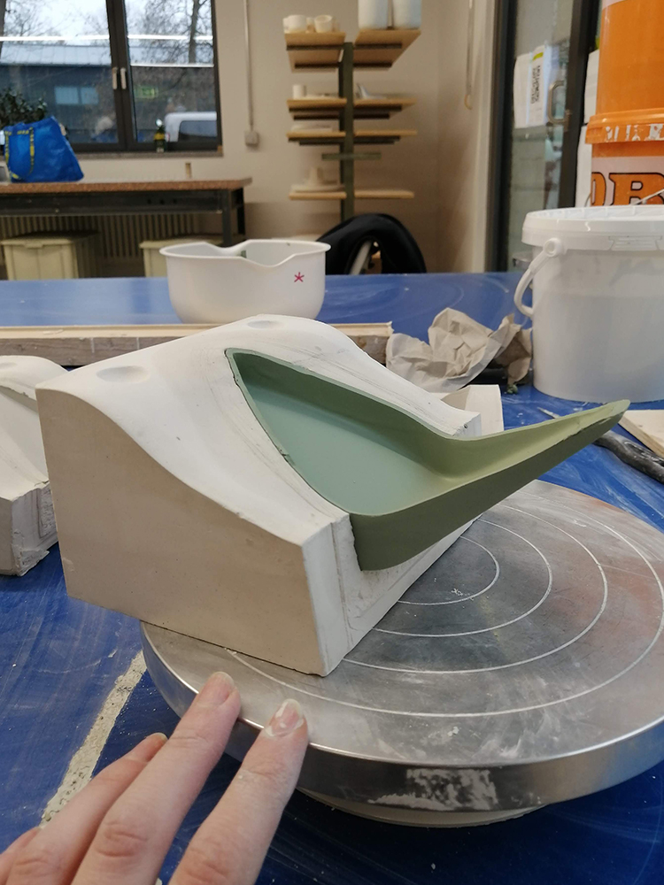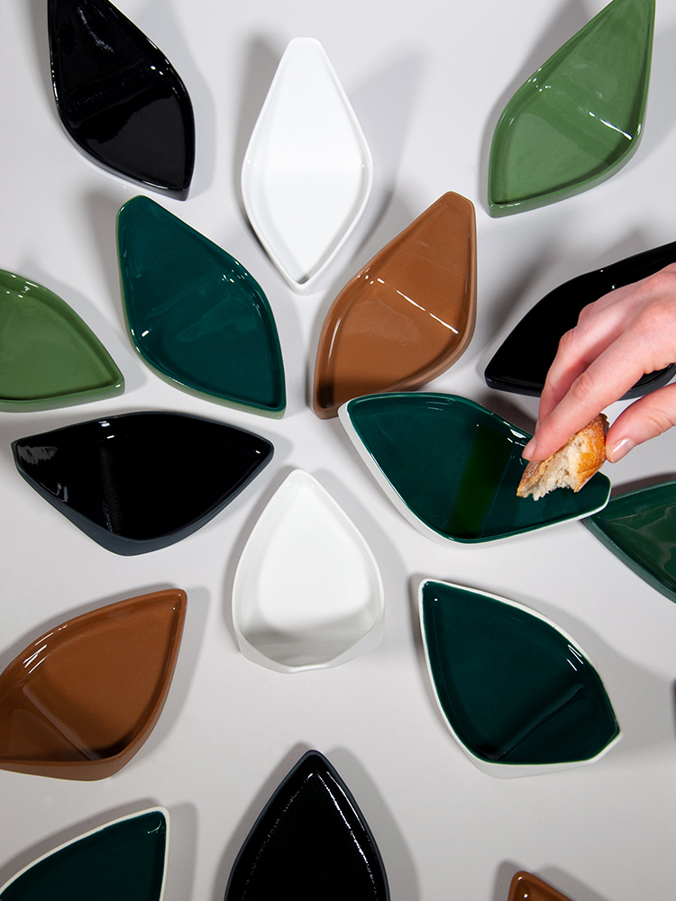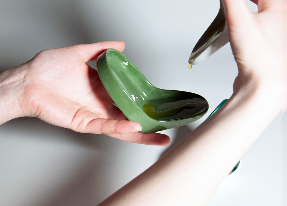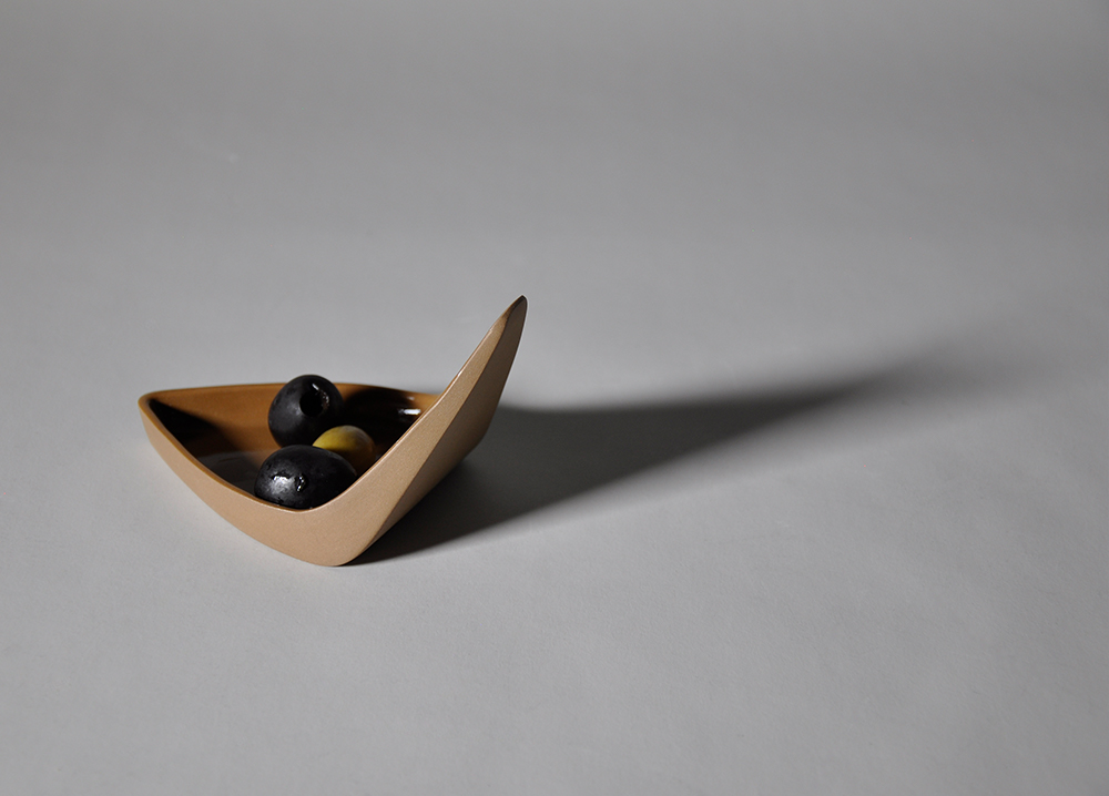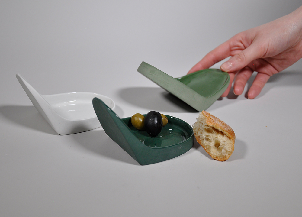 In diesem Semester habe ich mich mit der Frage beschäftigt, inwiefern die Identität einer Modemarke in Porzellan übersetzt werden kann. Ausgangspunkt waren die Produkte von Versace by Rosenthal, die eine eindeutig plakative Anmutung aufweisen und so eher wie Fanarktikel anstatt eigenständige Designs wirken. Genau hier habe ich konzeptuell angesetzt und eine andere Herangehensweise vorgeschlagen. Das Bestreben und erklärte Ziel von Gianni Versace, dem Gründer des Modehauses, für jede*n Kund*in ein perfekt angepasstes Kleidungsstück zu entwerfen, habe ich aufgegriffen. Versace entwickelte zahlreiche patentierte Stoffe und Techniken, um die unterschiedlichsten Körper perfekt in Szene setzen zu können. Dieser Anspruch an seine eigene Arbeit wird von der Tatsache unterstrichen, dass viele Kleidungsstücke der Marke ausschließlich maßgeschneidert werden. Ich habe mich von diesem Ziel inspirieren lassen und so beschlossen, in diesem Projekt für nur ein einziges Lebensmittel zu entwerfen. Da Versace bis heute ein Familienunternehmen mit Wurzeln in Mailand ist, war es logisch, sich auf mediterranes Essen zu konzentrieren. Letztendlich habe ich mich für die Olive entschieden. Diese alltägliche Frucht soll sich mithilfe meines Entwurfs von einer Beilage zum Star der Mahlzeit wandeln. Zuerst wird die Olive auf der Präsentationsfläche angeboten und verzehrt, anschließend soll auch die übrig gebliebene Marinade verwendet werden. Durch eine Kippbewegung fließt das Öl den Steg hinunter und kann nun mit einem Stück Brot aufgefangen oder auf eine andere Mahlzeit geträufelt werden. Indem der Nutzer dazu eingeladen wird, die Funktion des Schälchens für sich zu interpretieren, wird das Genießen in zwei Phasen zu einem Erlebnis.