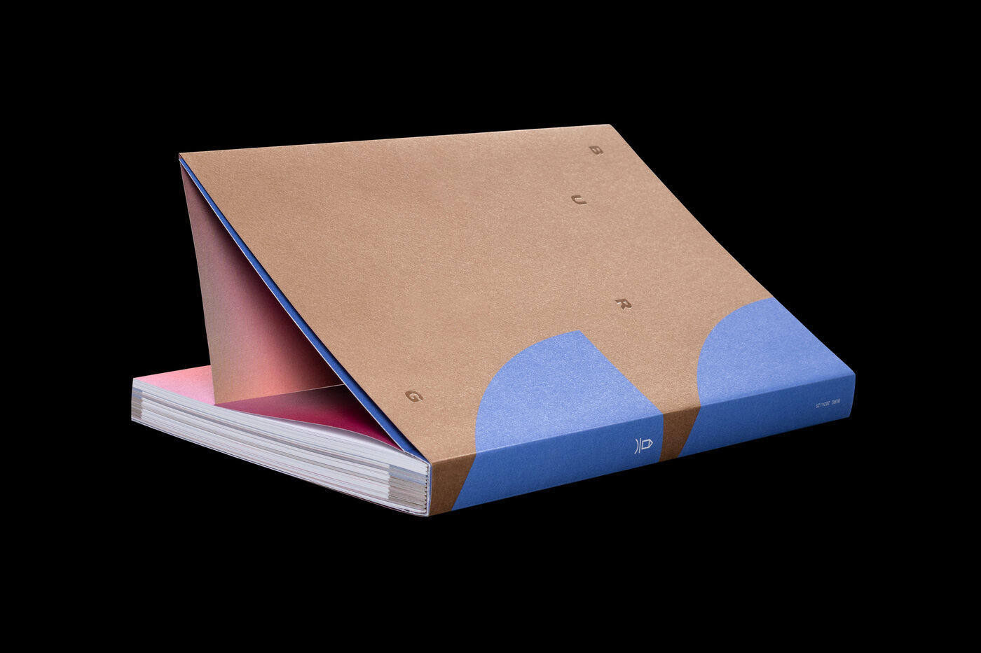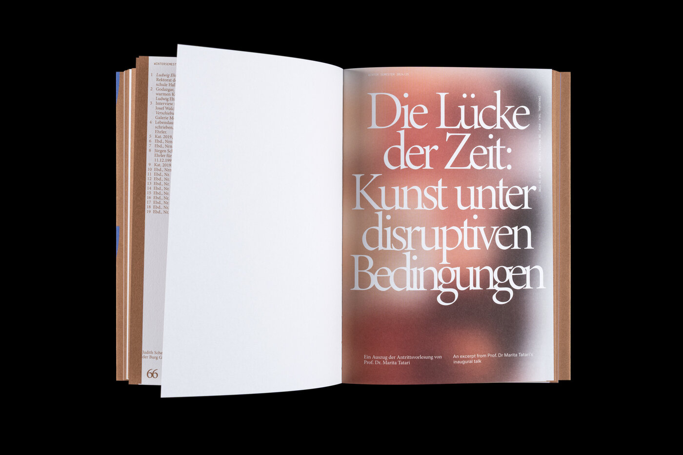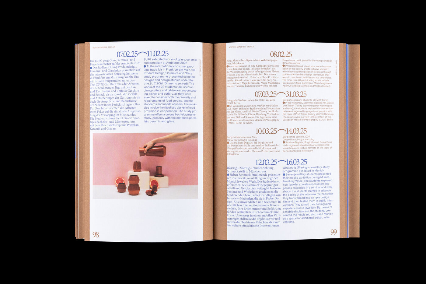 So nimmt das Jahrbuch ästhetische Bezüge zur im November 2024 relaunchten Website der BURG auf. Im englischen Fließtext kommt beispielsweise die Schrift „Friedl Beta“ von Camelot zum Einsatz, während assoziative Farbmischungen als visuelle Einstiege in die Highlight-Texte dienen. Das grafische Element des Bogens, ursprünglich aus dem Logo der BURG entlehnt, wird in der aktuellen Ausgabe spielerisch zweckentfremdet und fungiert als Bindestrich zwischen den kalendarischen Daten.