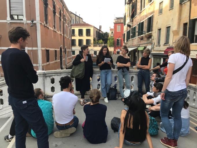 Die diesjährige Exkursion nach Venedig sowie zur Biennale di Venezia begann für 15 Studierende aus Kunst und Design mit einem Stadtspaziergang zusammen mit der ortsansässigen Kuratorin Agnes Kohlmeyer vor der Chiesa di San Polo mit ihren cinemaesken Tiepolo-Fresken. In der nahgelegenen Frari-Kirche fehlte zwar restaurationsbedingt Titizans Himmelfahrt der Maria, dafür leuchtete Bellinis wunderbar plastische Madonna mit Kind um so inniger aus der Kapelle. Das übergreifende Exkursionsthema des „Sozialen in der Kunst“ wurde sodann am Campo San Patalon das erste Mal greifbar: Hier hat sich pünktlich zum Biennale-Start Banksy an einem maroden Palazzo mit einem fackeltragenden Mädchen verewigt; worauf die Immobilienfirma Engel & Völkers das Gebäude sogleich als „Banksy Estate“ für sich reklamierte und den Preis „auf Anfrage“ setzte.