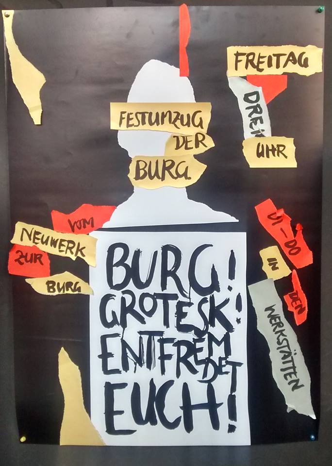 Als ein Höhepunkt der Festwoche wird es am Freitag, dem 29. Mai, um 14.30 Uhr einen BURG-Fasching zum Thema „BURG Grotesk – Entfremdet Euch!“ geben, der vom Campus Design am Neuwerk 7 bis zum Campus Kunst in der Seebener Str. 1 ziehen wird.