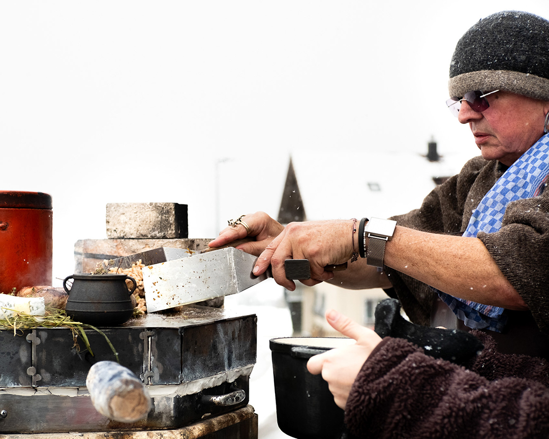 Durch die Kombination von erfahrbarer Handwerkskunst und kulinarischem Genuss bringen wir performativ die Menschen näher an die Ursprünge dessen, was sie essen und woraus sie essen, und fördert so die Wertschätzung für handgefertigte Arbeit und Schönheit des Prozesses.