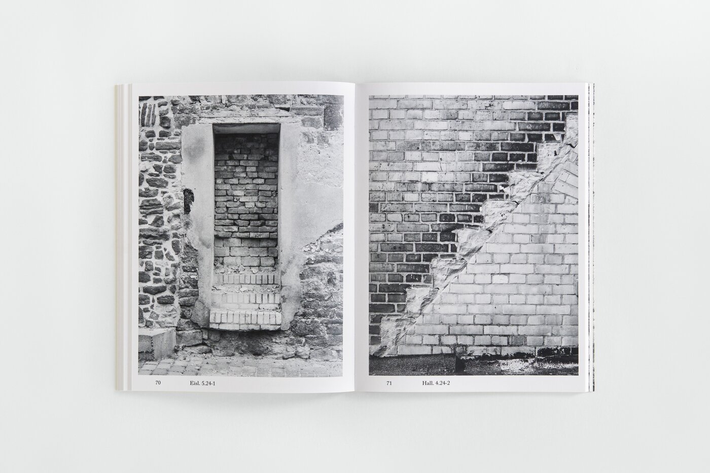 Fortlaufend (Spector Books, 2025) ist das zweite Buch von Stephanie Kiwitts groß angelegtem Projekt zum ländlichen Raum in Sachsen-Anhalt. Es zeigt schwarz-weiße Fotografien von Fassadenausschnitten, die in ihrer Materialität und Struktur plastisch wiedergeben sind. Stephanie Kiwitt dokumentiert alte und aktuelle bauliche Veränderungen, Türen und Fenster, die zugemauert sind, Bereiche, die abgerissen und durch neue ersetzt wurden – Spuren einer andauernden Anpassung an veränderte Lebensbedingungen und -situationen. Der Mensch, der für die Gestaltung seiner Umwelt maßgeblich verantwortlich ist, ist auf ihren Bildern zwar nicht zu sehen aber dennoch gerade durch seine Abwesenheit präsent. Wie wurde hier gelebt, wer wohnt hier oder was wird hier sein?