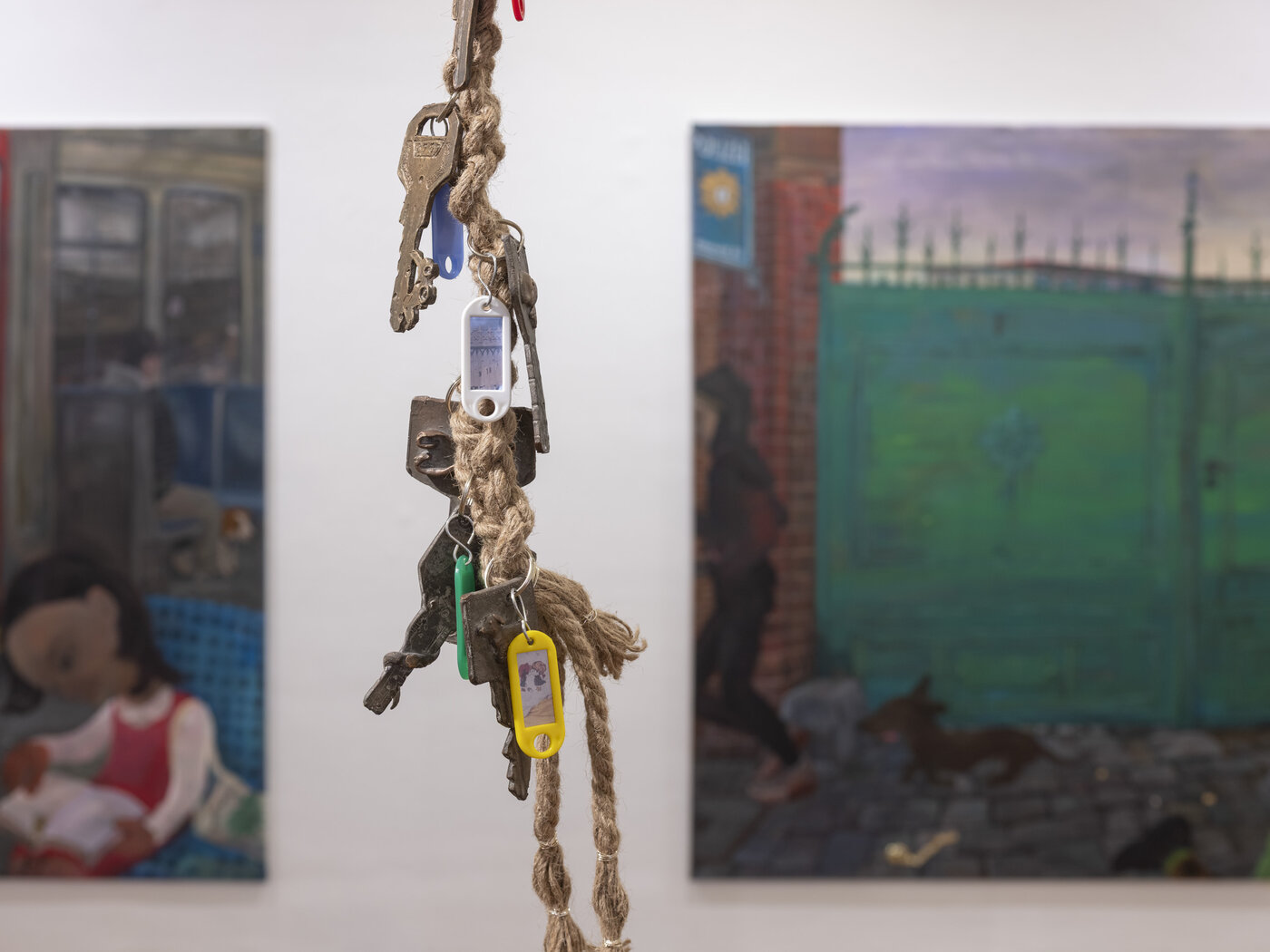 Youjeong Kim zeigt drei großformatige Bilder aus dem Zyklus Das Goldene Tor. Die Künstlerin ist während ihres Forschungszeitraumes der symbolischen Bedeutung von Toren nachgegangen. Inspiriert vom kunstvollen Tor ihres Elternhauses in Nonsan, Südkorea, untersucht sie die Symbolik von Abschied, Verlust und Heimkehr. Gold reflektiert Licht und äußeren Glanz, der ein dunkles Inneres verbirgt. Youjeong Kim fügt den Bildern bronzene, plastisch verzierte Schlüssel hinzu, die auf Öffnung und ein Zuhause verweisen.