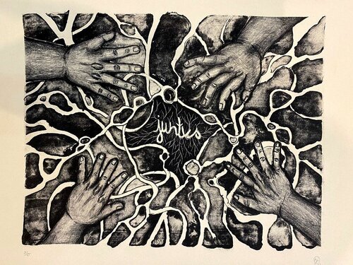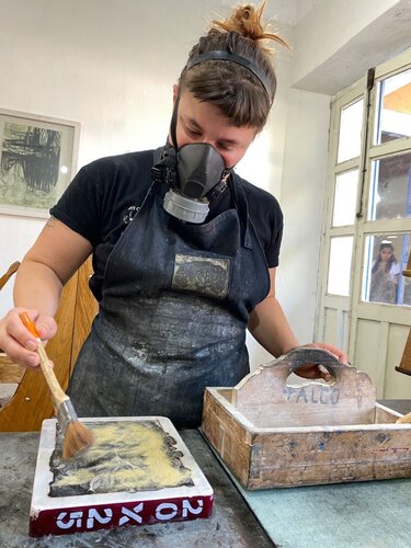 Der Ausstellungsraum 104 (Pförtnerhaus, Unterburg) der Klasse Malerei/Glas zeigt am 21. November 2023 die Ausstellung "Gráfica Rebelde - mexican print" von Anouk Lentz.