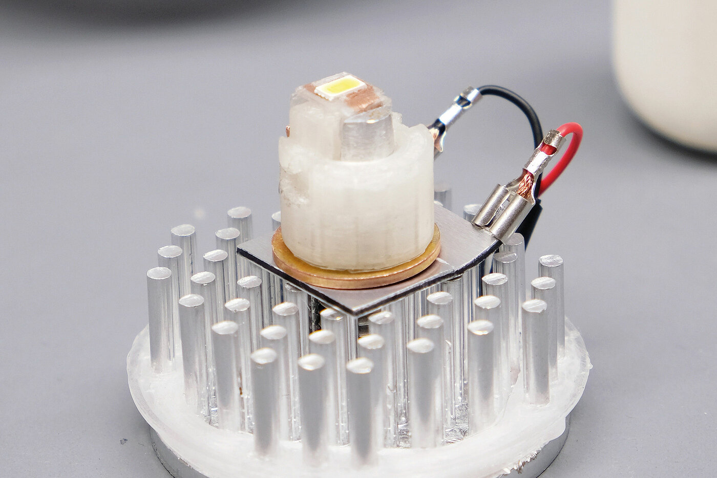 Die für einen zirkulären Lebenszyklus gestalteten Leuchtmittel des Luminaire-Cycle basieren auf der Verwendung einzeln austauschbarer LEDs. Dies reduziert den anfallenden Abfall auf ein Minimum und ermöglicht eine lange unabhängige Nutzung der Leuchten. Die auf kupferbeschichtete Kunststoffclips gelöteten Dioden können über Steckverbindungen in LED-Paneelen oder je nach Leistungsstärke in passiv gekühlten Fassungen eingesetzt werden. Die Paneele und Fassungen bestehen aus Aluminium und PLA Kunststoff.