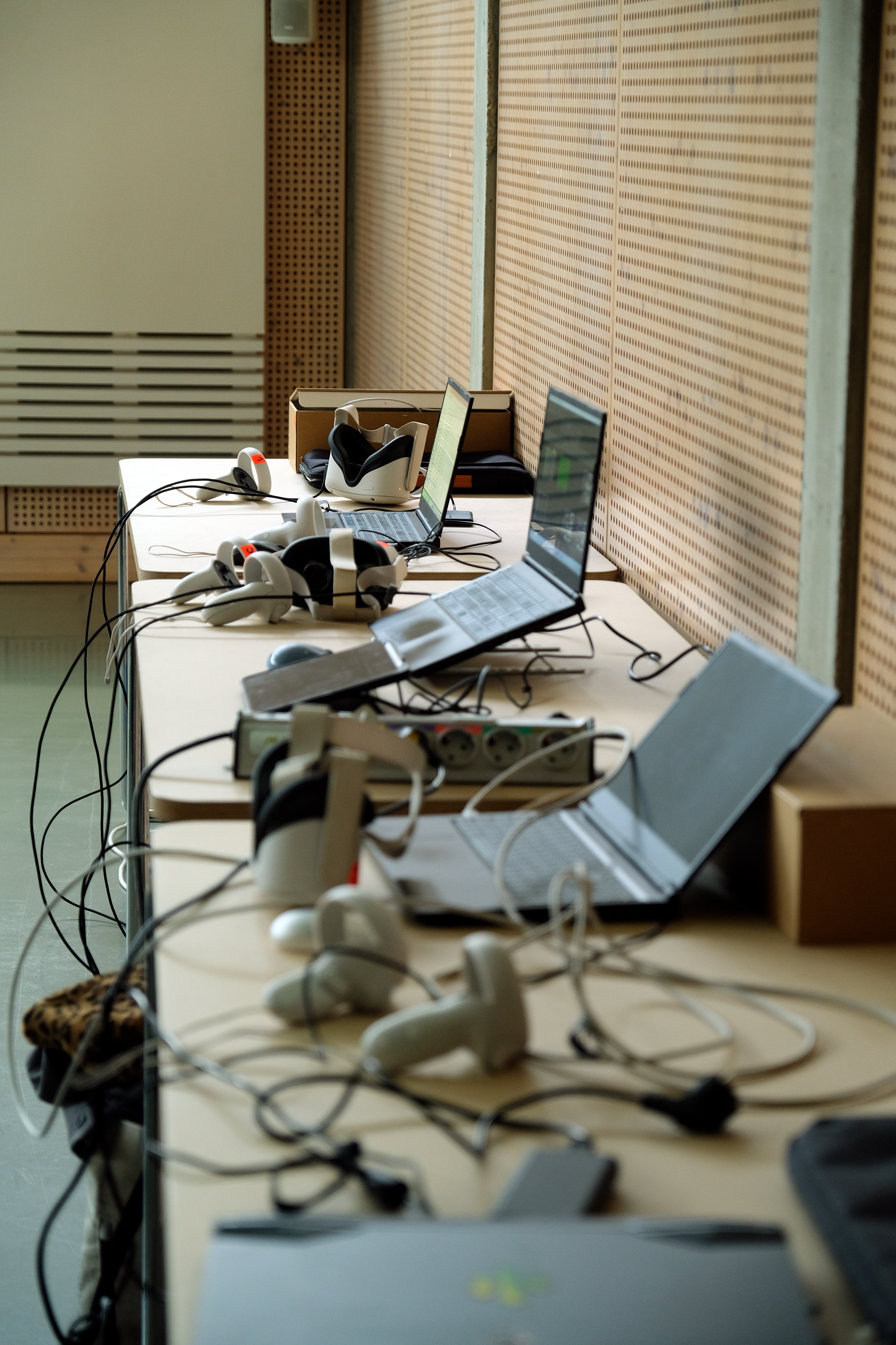 Die Ergebnisse konnten per VR-Brille erlebt werden und machten erfahrbar, wie Storytelling, Klang und Interaktion in immersiven Umgebungen zusammenwirken. Auch interaktive Elemente wurden genutzt – als Kritik an der Wegwerfgesellschaft, oder als spooky Aufgabe in einer Friedhofswelt. Der Workshop lud dazu ein, mit neuen Perspektiven zu experimentieren und die Grenzen des physischen Raums gestalterisch zu erweitern.