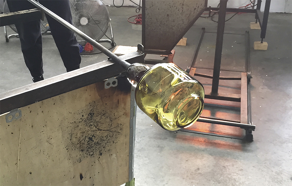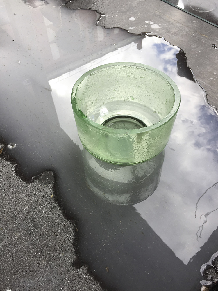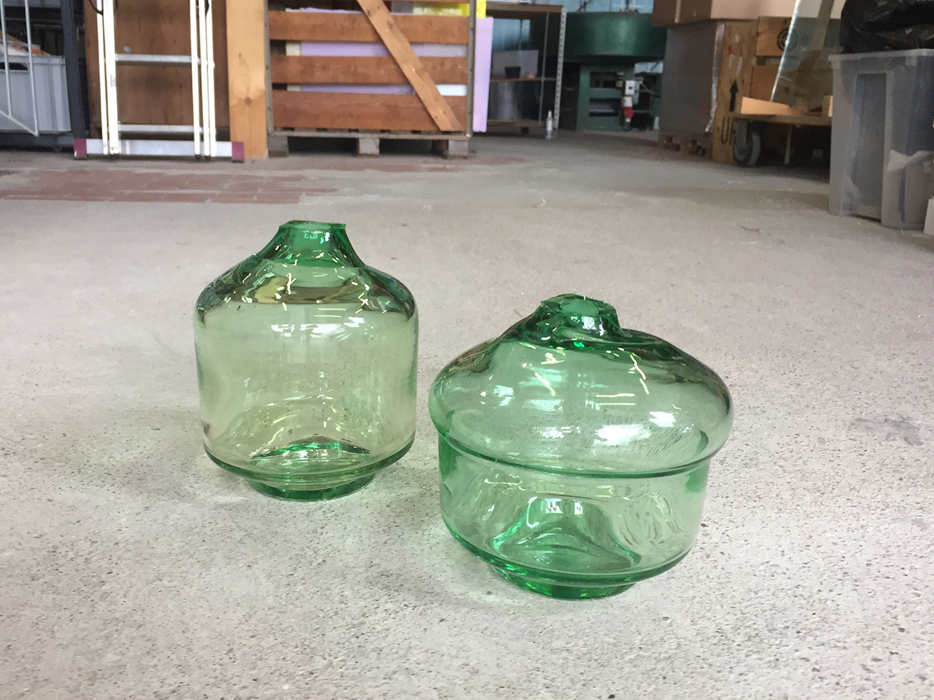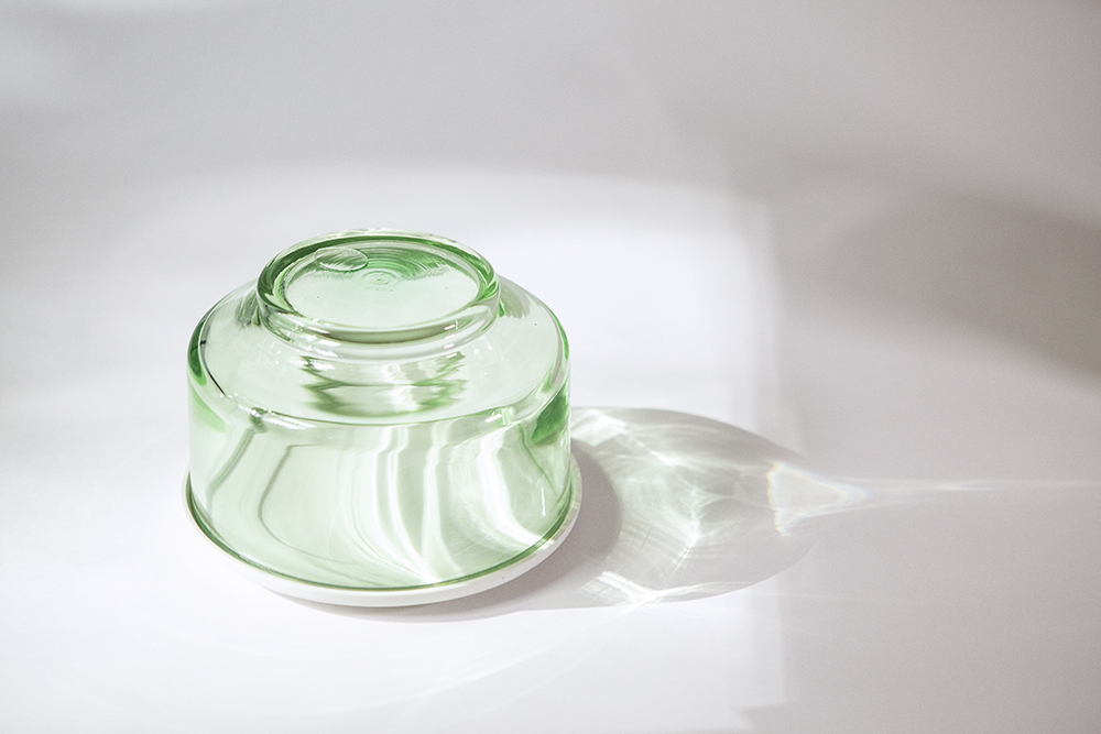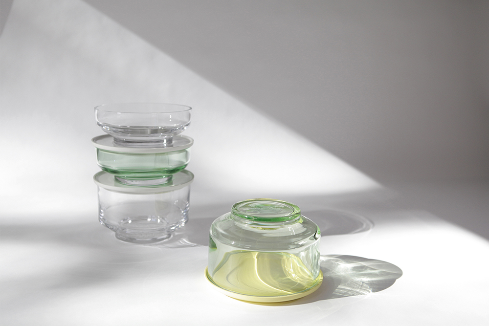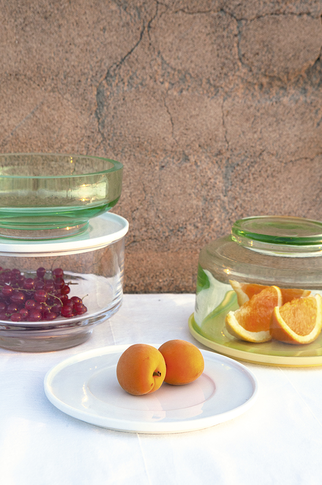 Salome ist ein Behältnis zur Aufbewahrung und Präsentation von Speisen. Die Schale aus grünem und klarem Glas setzt sommerliche Früchte oder andere Speisen auf dem Tisch in Szene. Sie kann als Gefäß oder umgedreht als Cloche (Glocke) Verwendung finden und wird durch einen Deckel beziehungsweise Teller ergänzt. Die mit Deckel verschlossenen Schalen lassen sich aufeinanderstapeln und können leicht im Kühlschrank verwahrt werden. Das dichte Verschließen wird durch einen Ring aus Silikon gewährleistet, der unauffällig in einer Vertiefung am Deckel sitzt. Der Deckel aus zitronengelbem und weißem Porzellan ist auf der Oberseite glänzend glasiert. Die Unterseite und der Rand des Tellers sind unglasiert und erscheinen seidenmatt. Die Glasschale gibt es in zwei verschiedenen Größen. Eine hohe Schale mit 10 cm und eine niedrige Schale mit 6 cm. Die Wandung der Schale öffnet sich mit einem leichten Winkel nach oben, während sich der Fuß mit einem leichten Winkel nach unten öffnet. Der Boden spannt sich als Bogen und ist stufenlos durch das Bodeneis im Fuß (die dicke Glasschicht am Boden von Glasgefäßen). Der Fuß hat eine Höhe von 1,2 cm und lässt sich durch die leichte Schräge gut greifen, wenn Salome als Cloche eingesetzt wird.