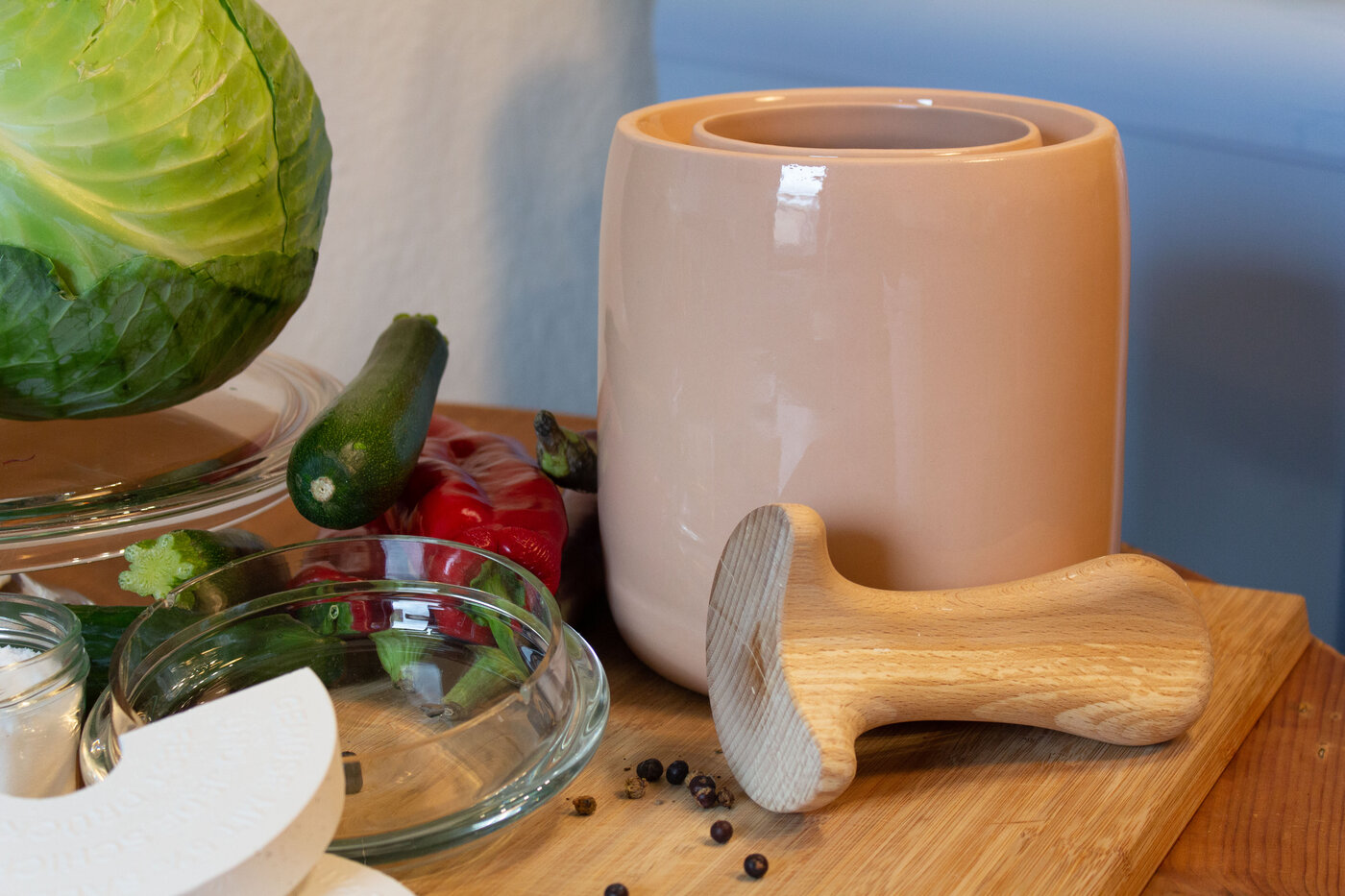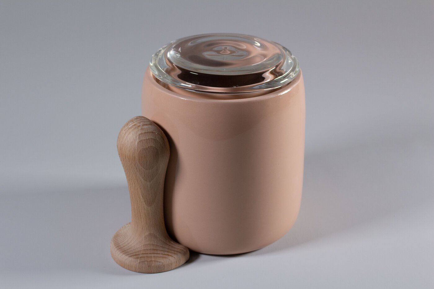 Weg vom sehr präsenten, fast schon grobschlächtigen Erscheinungsbildes des historischen Einmachtopfes aus Braunscherben, hin zu einer zurückhaltenden Präsenz, die in ihrer Funktion ihre Rolle übernimmt. Die vertretene Ästhetik soll ruhige Funktionalität verkörpern, die gleiche Verlässlichkeit ausstrahlen wie jahrelang Erprobtes, sich dabei aber in der Wohnsituation optisch zurücknehmen.