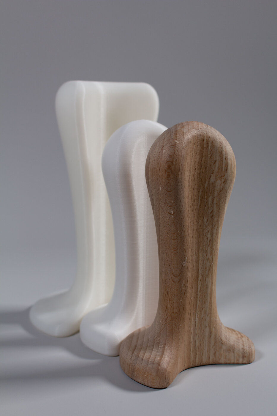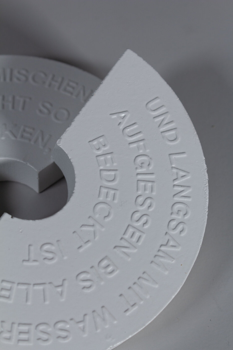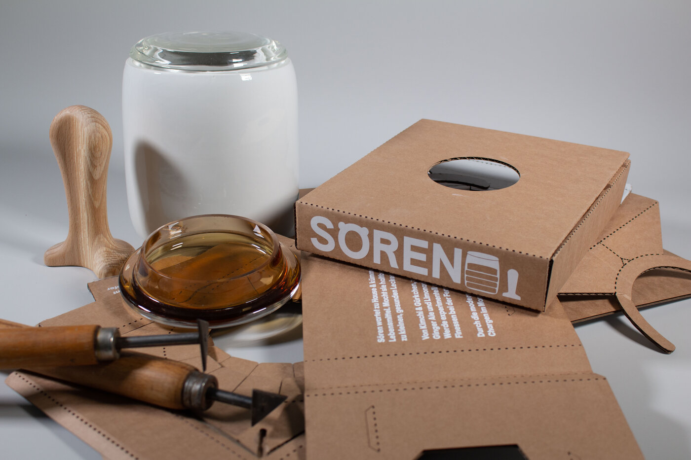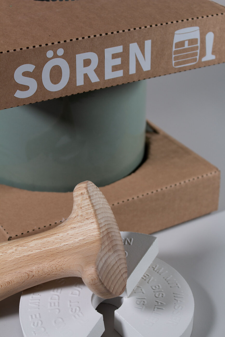 Um diese Merkmale erfüllen zu können, befasste ich mich zuerst mit dem Linearen, Praktischen. Die wichtigste Dimension im Gestaltungsprozess des Topfes ist der durchschnittliche Durchmesser einer geballten Faust. Eine leichte Handhabung soll somit immer gewährleistet sein. Um diesen Durchmesser herum erprobte ich verschiedene Weiten und Tiefen von Wasserrillen, bis ich zu einem gut entfernbaren Ergebnis gelangte. Dem Profil näherte ich mich von Geraden ausgehend, bis es sich zu einem langen Schwung von Fuß bis Rand schwingt. Gerade Kurve genug um den Bogen zu spannen und ‚Sören‘ ein stimmiges Erscheinungsbild zu schenken. Diesen Schwung nimmt der Deckel auf, lediglich kurz durch den Verschluss unterbrochen, führt er den sachten Bogen fort und rundet das Objekt wortwörtlich ab.