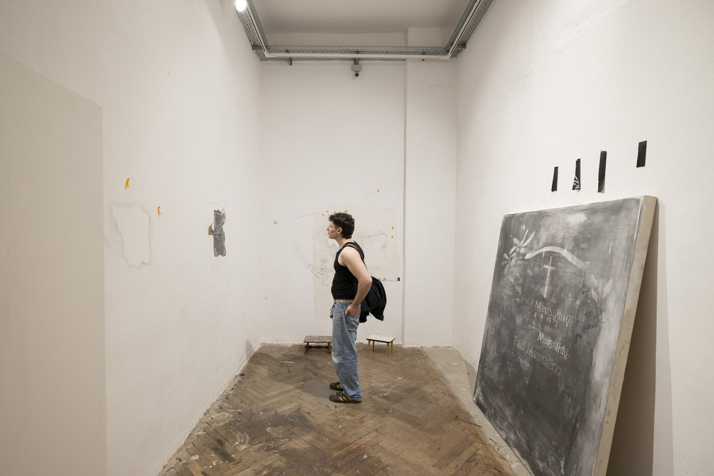 Sophia Roggenkamp konfrontiert uns mit einem großen Stapel von Stroh- und Heuballen, die uns mit ihrem Duft an dörfliche Habitate erinnern und aus denen zugleich Erzählstimmen aus dieser ländlichen Realität dringen. Die Künstlerin reflektiert ihre Herkunft aus einer landwirtschaftlich geprägten Familie vor dem Hintergrund ihrer aktuellen städtischen Lebensweise. Die Unterschiede schärften zugleich ihren Blick für Veränderungen in beiden Lebenswelten, die sie in zwei großformatigen Fotografien, die Spuren der Industrialisierung des ländlichen Raumes aufweisen, dokumentiert. Gesa Wagners Arbeiten bewegen sich im Spannungsfeld von Skulptur, Zeichnung und Installation. Darin setzt sie sich mit den Geschichten auseinander, die sich mit Orten und Gegenständen verbinden. Dabei nutzt sie vorgefundene, einfache Materialien wie beispielsweise ausgediente Fischernetze aus Marseille. Ihre künstlerische Arbeit widmet sich der fortlaufenden Transformation von Erinnerung und Material und der Frage, ob das Vergangene diesem dennoch eingeschrieben bleibt. Indem sie sich den Prozess der Transformation aneignet und Vorgefundenes umgestaltet, schafft die Künstlerin neue Erzählungen. Auch Paul-Jakob Meussling interessieren Aspekte von Zeitlichkeit, jedoch vor dem Hintergrund von Fragen nach Vergänglichkeit und Tod. In dunklen Graphitzeichnungen interpretiert er das Motiv des Totentanzes neu und setzt sowohl Schädel wie Skelette als teils skurrile Bildmotive ein. Die Werke sind von der Frage durchdrungen, wie wichtig wir uns selbst nehmen und wie wir versuchen, über das „menschliche Elend“ zu lachen. Doch dieses Lachen bleibt einem oft im Halse stecken. Daniela Trabold wiederum widmet sich verschiedenen Perspektiven auf Radioaktivität und Atomkraft. Dafür besuchte sie u den Ort Jáchymov in Tschechien, ein ehemaliges Abbaugebiet für Uran, der zugleich Kurort für Radon-Anwendungen war und ist. Mit Fotografien von dort und anderen Orten, mit Uranglas und Schwarzlicht schafft sie im Galerieraum eine besondere Raumatmosphäre, die die herausfordernden Qualitäten des radioaktiven Elements und den Umgang mit ihm in den Blick nimmt. Durch die Strategie der ästhetischen Verfremdung beleuchtet sie versteckte Dimensionen der Radioaktivität. Als fremd und zeitlos erleben wir Jan Marco Herzogs Keramikobjekte aus seinem Werkzyklus Genesis. Aus Resten, Fundstücken, neu Geformtem und bereits Gebranntem „wachsen“ die – den Künstler an Steine erinnernden – Formen. Diese Objekte mit ihren Ausbuchtungen, Löchern, Auskragungen, teils auch verschlungenen Durchgängen und amorphen Oberflächen erinnern an die Formungsweisen geologischer Prozesse: an Hitze, Druck und Ablagerungen als Einflüsse in der Natur. Ähnlich verborgen verweisen seine Objekte auf zuvor wirkende Kräfte. Auf den ersten Blick enigmatisch wirken auch die Emaille-Collagen von Anne Pruy, die sich zwischen Plastik und Malerei bewegen. Ausgangspunkt sind dafür oft alltägliche Beobachtungen, die sich auf Flüchtiges und schwer greifbare Phänomene konzentrieren. Durch Fragmentieren, Skalieren und Neuordnen der notierten Formen entstehen Bilder, in denen Sichtbarkeit, Überlagerung und Verdeckung eine zentrale Rolle spielen. Wir sehen eine visuelle Sprache, die weniger abbildet als auslotet: Fläche wird zu Raum, Form zu Geste, Farbe zu Träger von Wahrnehmung. Julius Anger dagegen zielt mit Malerei, Siebdruck, Skulptur und Film auf eine grundsätzliche Frage, die sich mit Aufmerksamkeitsdefiziten durch Medienkonsum und deren Folgen für die Psyche auseinandersetzt. Er sieht die Kunst in der gesellschaftlich ästhetischen Verantwortung für einen kritischen Umgang damit. In seinem Werk erleben wir das jeweilige Medium nicht als Begrenzung, sondern als Möglichkeit, existentiellen Fragen nachzugehen, Grenzen auszuloten und zugleich zu verwischen. Seine Protagonisten sind oft Tiere, Texte bleiben kryptisch, bis wir erkennen, dass es sich um Spiegelschrift handelt. Wen oder was sehen wir im Spiegel?