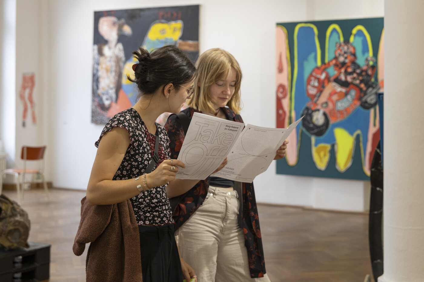 An den Sonntagen, 20. Juli, 27. Juli und 3. August 2025 führen um 15 Uhr Studierende der kunstpädagogischen Studiengänge sowie des Masterstudiengangs Kunstwissenschaften durch die Ausstellung Take Off 2025. Die Teilnahme ist kostenfrei, eine Anmeldung nicht erforderlich.