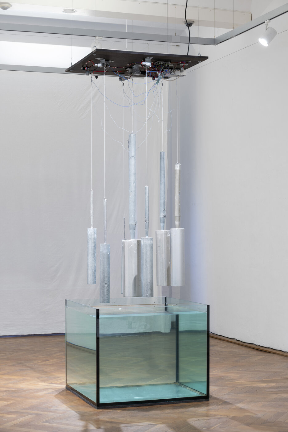 In der Installation von Luis Kießling dagegen tauchen in einer zehnminütigen Vorführung sieben unterschiedlich große Orgelpfeifen mit Klangkörpern in ein 800 Liter großes Wasserbecken ein. Das Eintauchen erfolgt nach dem Zufallsprinzip und erzeugt so ständig wechselnde Klangkompositionen. Nach Ablauf der zehn Minuten kehren die Klangkörper wieder in ihre Ausgangsposition zurück. Anschließend folgt eine 15-minütige Pause. Selbstständig beginnt der Ablauf erneut und entwickelt ein weiteres Stück. Die Klänge verbinden sich mit dem Plätschern und den Bewegungen des Wassers sowie mit Geräuschen der Motoren, der Schnüre und ihrer Reibung. So entsteht eine Installation, die selbstständig agiert sowie Raum und Klang miteinander verbindet.