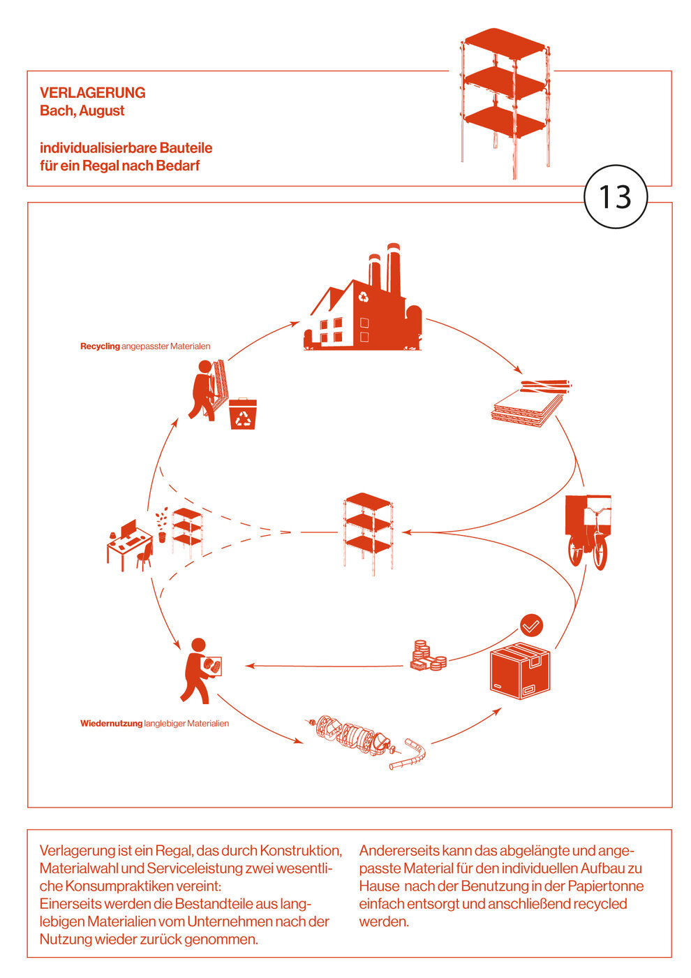 wiederverwendet oder recycelt werden können. Das Konzept berücksichtigt die unterschiedliche Lebensdauer dieser Materialien. Die langlebigen Verbindungselemente können, sobald sich die Wohnumstände der Nutzer ändern und das Möbelstück nicht mehr benötigt wird, einfach zurückgeschickt werden. Dies erfolgt mit der Motivation, einen Anteil des ursprünglichen Kaufpreises erstattet zu bekommen. Die sperrigen Pappteile hingegen lassen sich unkompliziert im Altpapier entsorgen. Nach der Entsorgung werden die Papp-Elemente gesammelt und recycelt. In Recyclinganlagen werden sie in Wasser aufgelöst, von Verunreinigungen befreit und zu neuer Papierpulpe verarbeitet. Diese Pulpe wird anschließend zu neuen Papierbahnen geformt, getrocknet und erneut genutzt – beispielsweise für die Produktion neuer Kartons oder Papprohre. Die langlebigen Bauteile aus Polypropylen und Stahl durchlaufen nach der Rücksendung eine Prüfung auf Funktionalität und Abnutzung. Sind sie weiterhin verwendbar, werden sie erneut in den Vertrieb gebracht, um ihre Nutzungsdauer zu maximieren. Sollte der Verschleiß zu groß sein, werden die Materialien sortiert und dem Recycling zugeführt. Dadurch amortisiert sich der höhere Herstellungsaufwand dieser Bauteile durch eine längere Gesamtlebensdauer und eine Reduktion des CO₂-Ausstoßes. Ein wesentlicher Vorteil des Regals "Verlagerung" ist seine hohe Anpassungsfähigkeit. Der Zusammenbau erfordert lediglich einen Cutter, um die Pappteile individuell auf die gewünschte Größe zuzuschneiden. Das System ermöglicht eine stufenlose Anpassung in Höhe, Breite und Länge, sodass es sich flexibel an verschiedene Raumsituationen anpasst. Darüber hinaus können Nutzer das Regal im gleichen Nutzungszeitraum nachträglich verkleinern oder erweitern, indem sie Böden und Rohre erneut zuschneiden. Der Name "Verlagerung" trägt eine doppelte Bedeutung. Er verweist einerseits auf die räumliche Flexibilität des Möbelstücks, andererseits auf die strukturelle Verlagerung von Produktions- und Konsumprozessen. Das Konzept reflektiert bestehende Konsumgewohnheiten, die zur Wegwerfkultur beitragen, ohne zu versuchen, diese fundamental zu verändern. Die konventionelle Massenproduktion ist darauf ausgelegt, durch Trends, Werbung und Preissenkungen einen hohen Absatz zu generieren – was zwangsläufig zu einer frühzeitigen Entsorgung von Möbeln führt. Das Konzept "Verlagerung" kann diesen Mechanismus nicht durchbrechen, aber es bietet eine Möglichkeit, den damit verbundenen Ressourcen- und Energieverlust zu reduzieren. Gleichzeitig wirft das Konzept grundlegende gesellschaftliche Fragen auf: Ist das der einzig gangbare Weg, anhand von vornherein kurzlebiger, dafür energieeffizienter Materialien der frühen Entsorgung Rechnung zu tragen, oder sind wir bereit, unsere Konsumgewohnheiten so zu verändern, dass wir die Wegwerfkultur überwinden? Ist es realistisch, eine Rückkehr zu langlebigen Möbeln anzustreben, die für Generationen gedacht sind? Wie können industrielle Fertigungsprozesse nachhaltiger gestaltet werden, ohne dass wirtschaftliche Interessen dem entgegenstehen? "Verlagerung" ist somit nicht nur ein Möbelkonzept, sondern steht auch stellvertretend für Richtungsentscheidungen, wie wir als Gesellschaft Kreislaufwirtschaft in Verbindung mit schnelllebigen und dynamischen Lebensweisen denken können.
