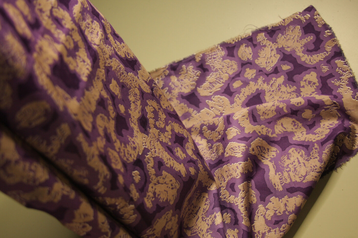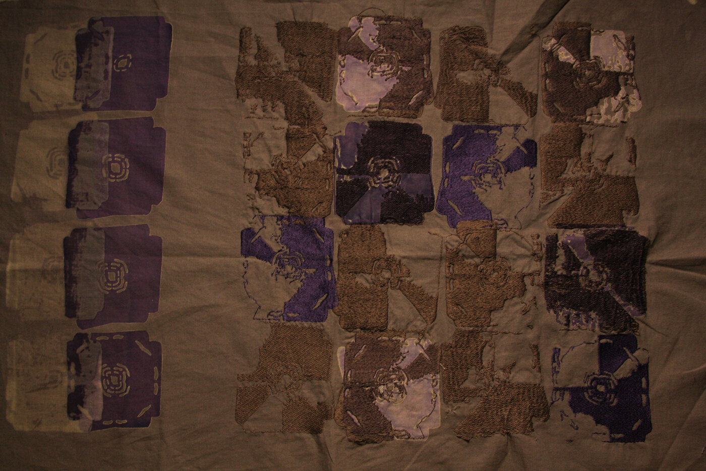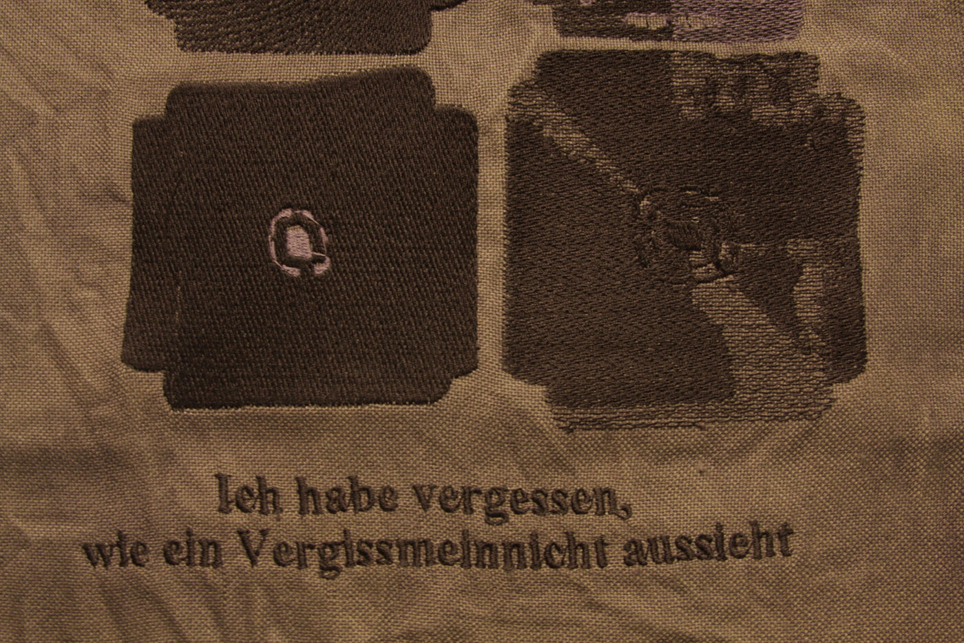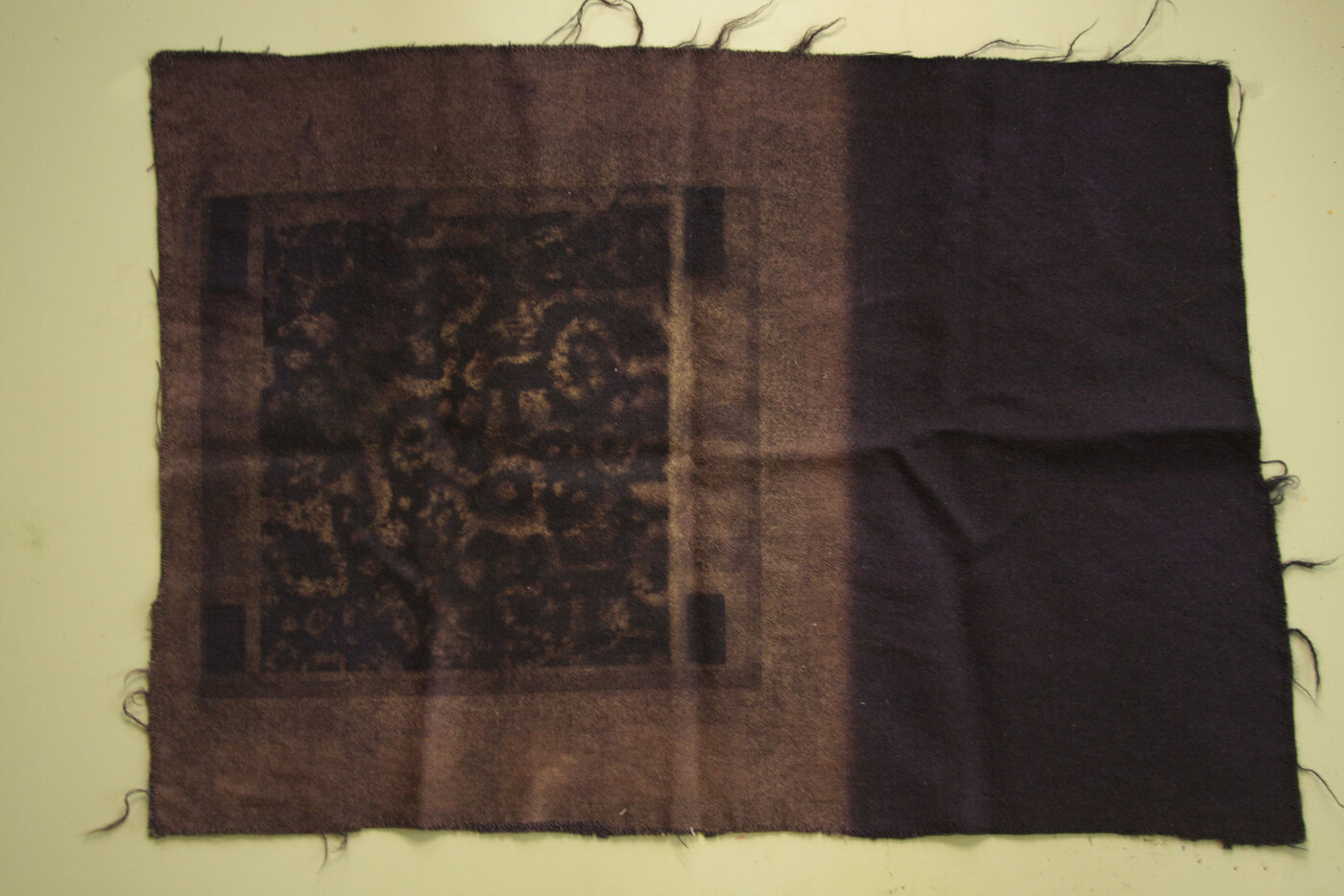 Dieser Ansatz wurde zur Musterentwicklung verwendet. Die Eigenschaften der verschiedenen Materialien und Techniken verstärken die Materialproben auf metaphorische Weise zunehmend- zum Beispiel die schlechte Lichtechtheit der Blauholzfarbe, die Verwischung der Farben nach dem Siebdruck und Arbeiten in Schichten. Als Entwurf habe ich versucht, ein Vergissmeinnicht aus dem Gedächtnis zu zeichnen, wobei mein Kopf viele verschiedene Blumen miteinander vermischte.