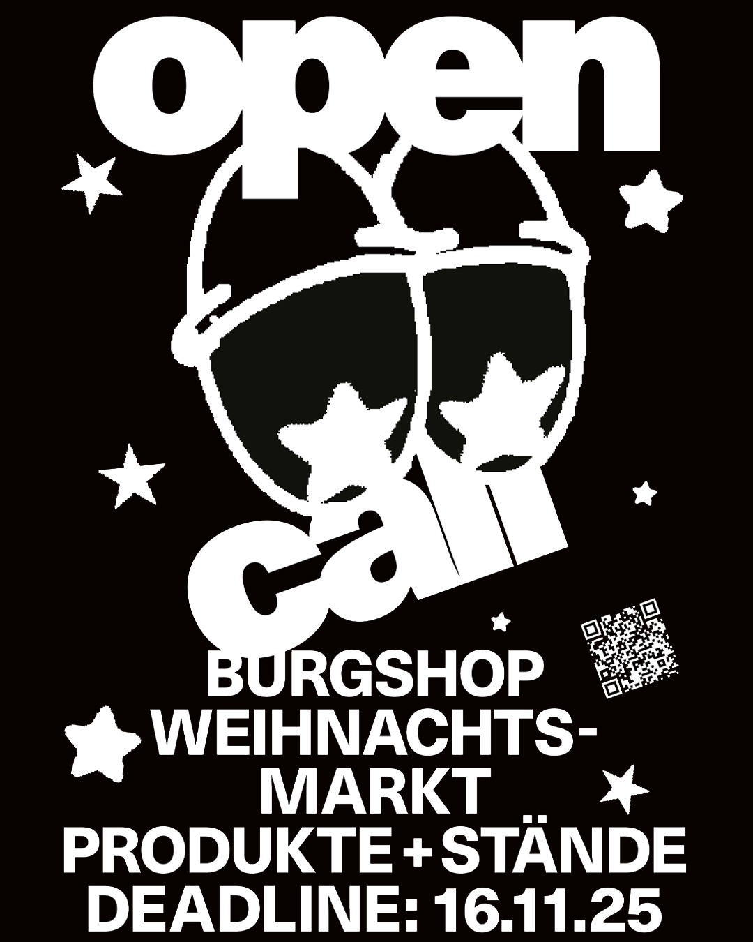 Am 13. und 14. Dezember 2025 lädt der Burgshop zum alljährlichen Weihnachtsmarkt auf den Campus Design der Kunsthochschule Burg Giebichenstein in Halle ein. Neben einer kuratierten Auswahl an Produkten des Burgshops werden Studierende, Absolvent*innen und Mitarbeiter*innen eingeladen, ein buntes Angebot aus Kunst, Handwerk, Design, Print, Kulinarik und Musik anzubieten. Sowohl Produktvorschläge für den Burgshop als auch Bewerbungen für eigene Stände (Produkt, Kunst, Handwerk, Print, Essen, Trinken, etc.) sind möglich.