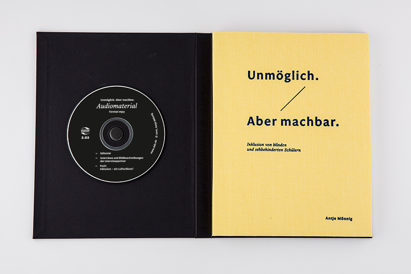 „Unmöglich. Aber machbar. Inklusion von blinden und sehbehinderten Schülern“ ist die Master-Abschlussarbeit von Antje Mönnig und entstand im Fachbereich Editorial Design der Burg Giebichenstein Kunsthochschule Halle, betreut von Prof. Anna Berkenbusch.