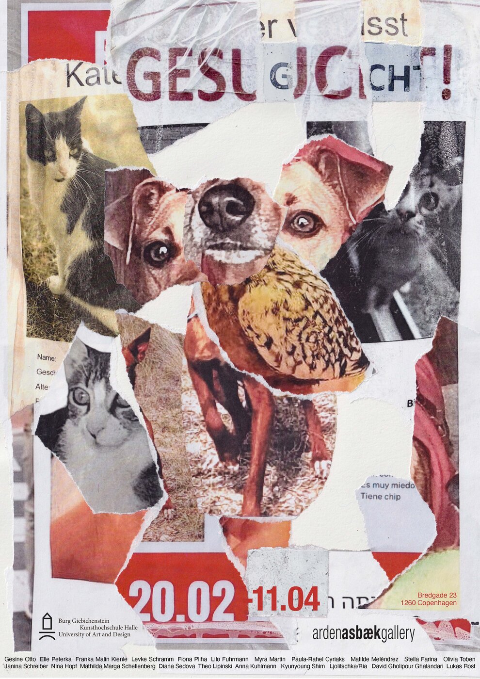 In der Ausstellung Gesucht! präsentieren Burg-Studierende der Studienrichtung Grafik, unter der Leitung von Prof. Paul McDevitt, ihre Werke in der Arden Asbæk Gallery in Kopenhagen. Ausgangspunkt des Projekts war ein vertrautes Bild aus dem urbanen Alltag: Plakate mit der Überschrift „Gesucht!“, die in der Nachbarschaft auf vermisste Haustiere aufmerksam machen.