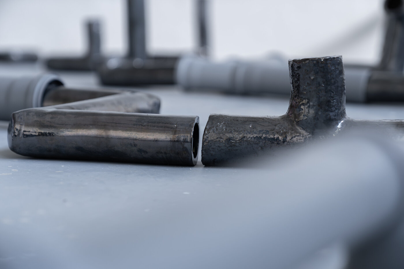 Die Kombination industrieller HT-Rohre mit fragilen Keramikfragmenten macht die Spannung zwischen Funktionalität und Dysfunktionalität auch formal sichtbar. Gleichzeitig ermöglicht sie eine flexible, ortsspezifische Installation – wandelbar, in Bewegung und verletzlich, wie auch zwischenmenschliche Beziehungen selbst.