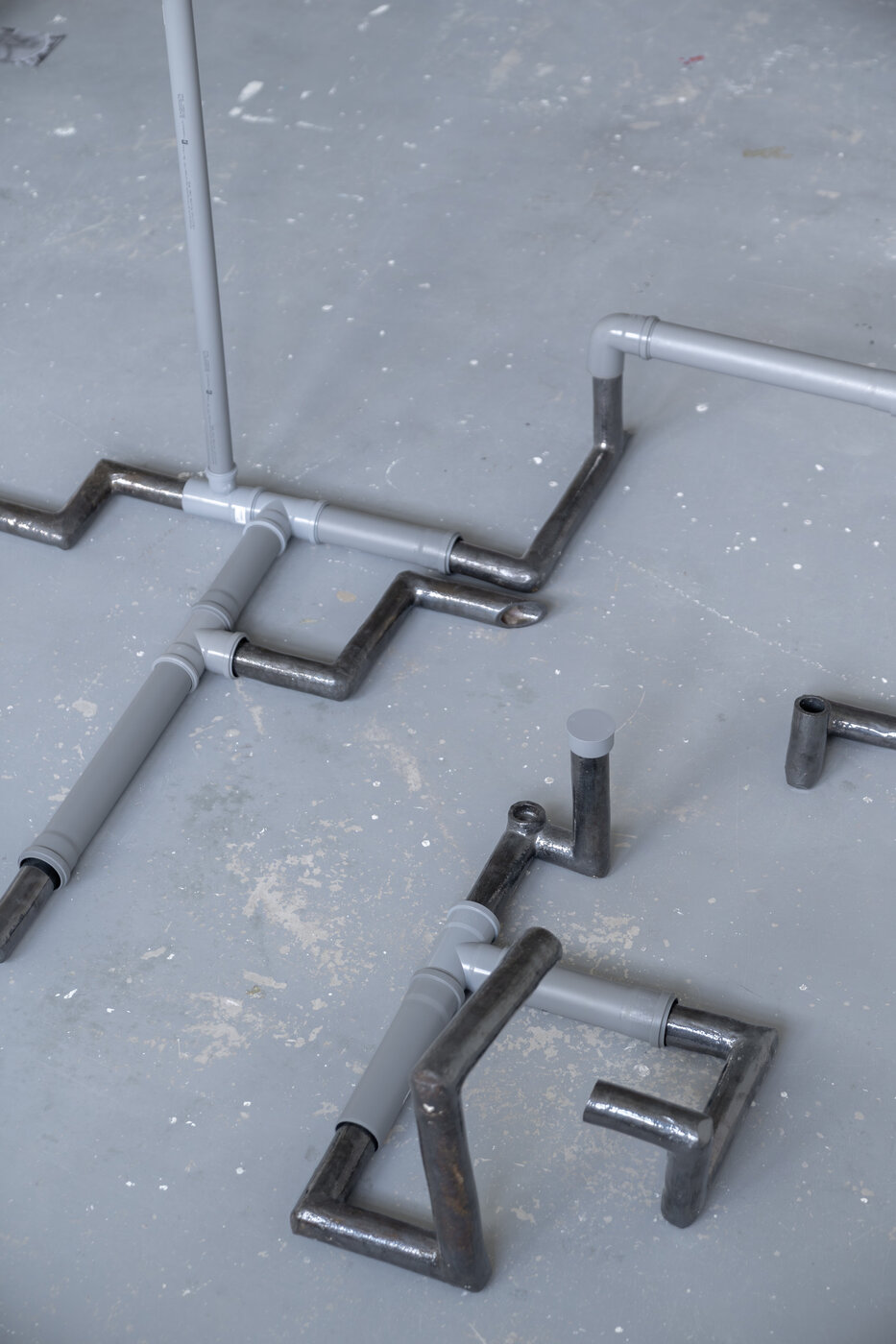 Die Arbeit I love you, but... (2025) orientiert sich formal an alltäglichen Abflusssystemen – technischen Infrastrukturen, die meist unsichtbar im Hintergrund operieren, aber essenziell für das Funktionieren unseres Alltags sind. In einer modularen, offen angelegten, labyrinthartigen Struktur mit linearen und verzweigten Achsen lässt sich die Skulptur als Sinnbild für Beziehungssysteme