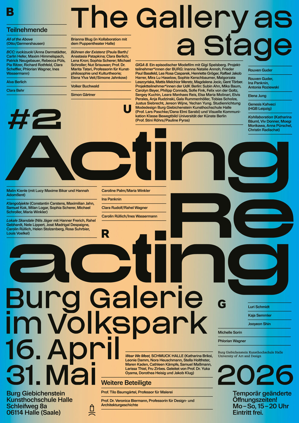 Mit The Gallery as a Stage #2_Acting/Reacting verwandelt sich die Burg Galerie im Volkspark vom 16. April bis 31. Mai 2026 in einen experimentellen Bühnenraum. Die Ausstellung bricht bewusst mit der bisherigen Wahrnehmung der Burg Galerie: Sämtliche Räume erhalten neue Funktionen und eröffnen ungewohnte Möglichkeiten für Interaktionen und Auftritte. Im Zentrum steht eine eigens aufgebaute Bühnensituation im großen Galerieraum, die den Ort zum performativen Experimentierfeld macht. Nach einem Open Call an der BURG wurden von einer hochschulinternen Jury 27 Bewerbungen für die Realisierung ausgewählt. Über einen Zeitraum von sechs Wochen nutzen mehr als 100 Studierende, Alumni und Lehrende die Galerie als Raum für Performances, Lectures, Aktionen, Installationen und intensiven Austausch. Die Burg Galerie wird damit selbst zur Akteurin: als Bühne, Labor und sozialer Treffpunkt zugleich.