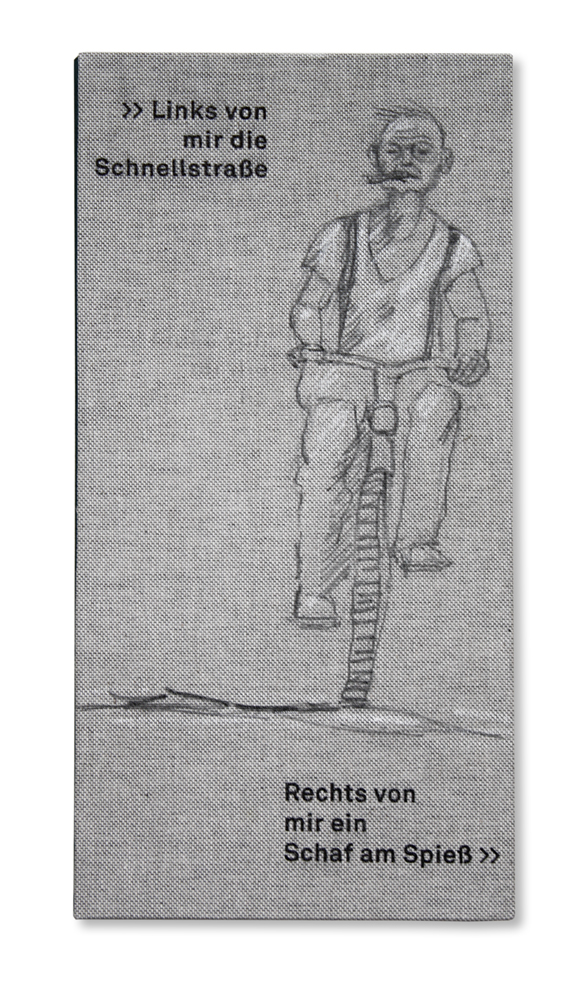 Links von mir die Schnellstraße, rechts von mir ein Schaf am Spieß. Digitaldruck, modifizierte Schmetterlingsbindung. 28 x 15 cm, 2013.