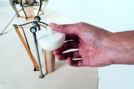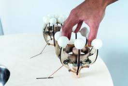 In this gesture study common smartphone and laptop gestures are translated into a more sensual and physical experience. While we never feel resistance when zooming in on our smartphone or scrolling down on our laptop this tool provides physical feedback for our hands when using these gestures. When using the tools one can regulate the amount of water coming out of the faucet in the middle of the table.