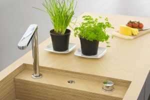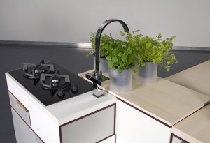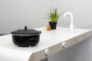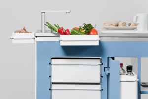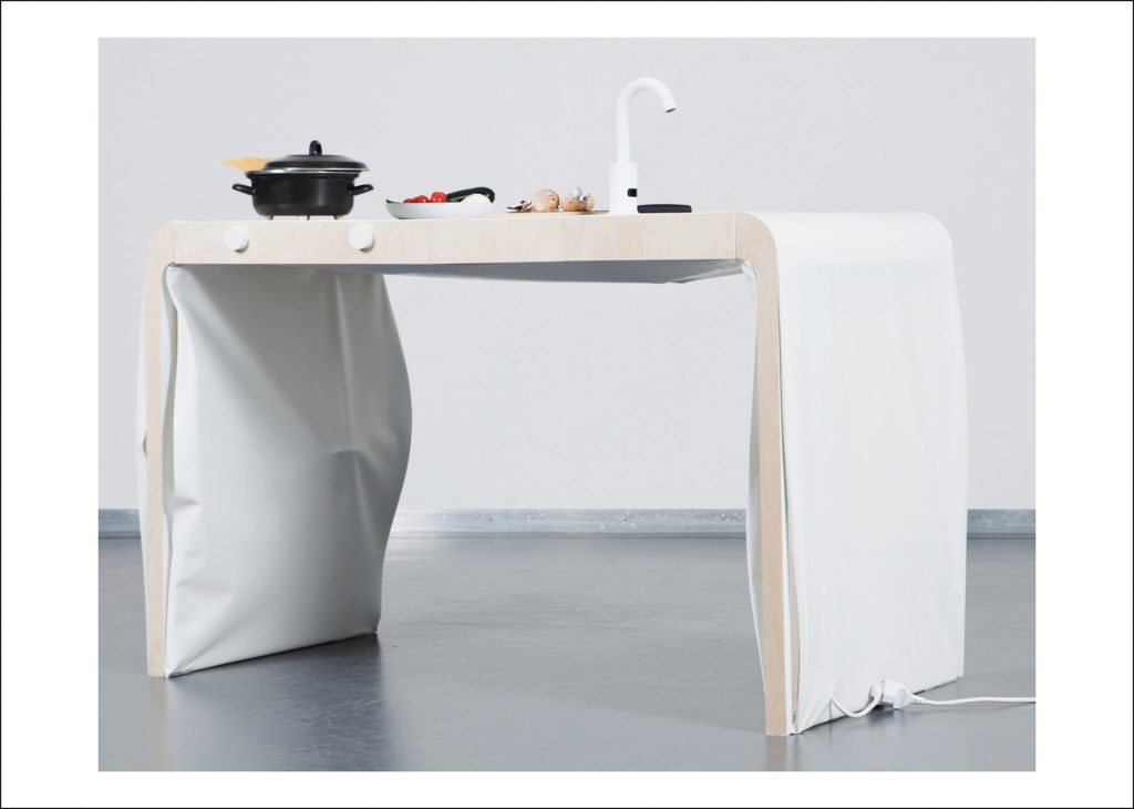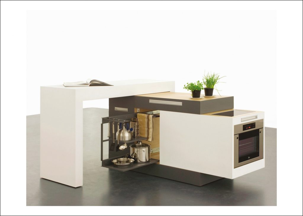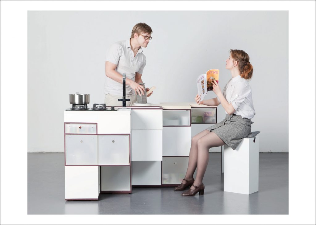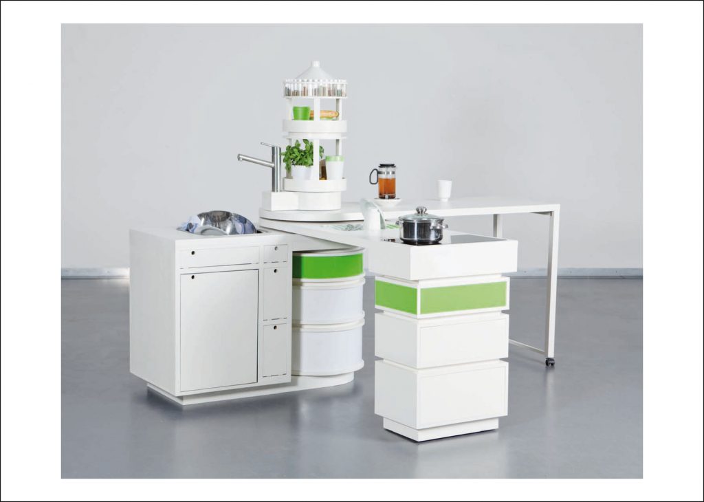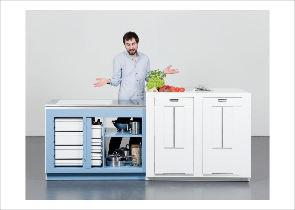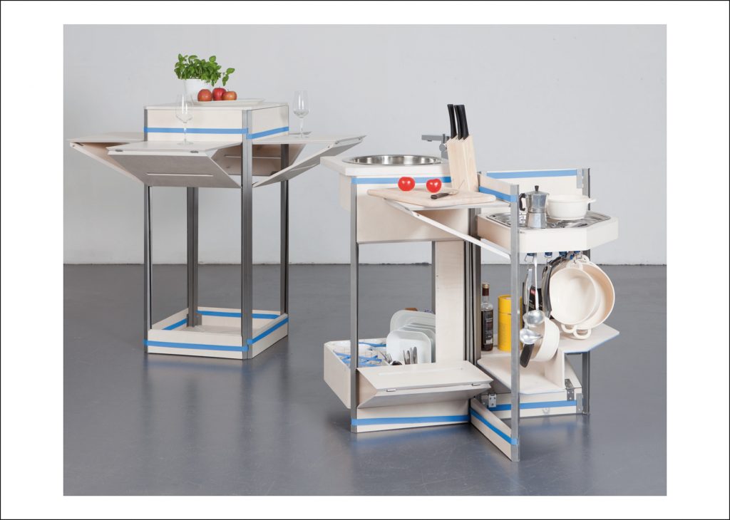 Auf nur 1 qm im geschlossenen Zustand befindet sich eine vollwertige Küche mit Kühlschrank, Induktionskochfeld, Backofen, Spüle, Stauraum und Esstisch. Wenn der Nutzer den Tisch wegrollt und die Kocheinheit herauszieht, erweckt er small type zum Leben.