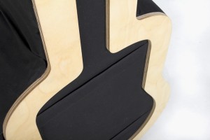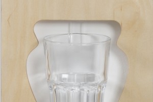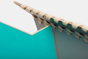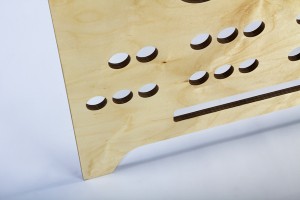 Das funktionale Regal Aquädukt erinnert durch klaren Rhythmus und strenge Symmetrie an antike Architektur. Schnörkellos kommt es mit dem Nötigsten an Horizontalen und Vertikalen aus. Es bedarf durch die feste Klemmung der Teile keiner Querverstrebung. Abgeleitet vom Format der Schallplatte und des Aktenordners ergibt sich das Fachmaß von 33x33x33 cm. Die Materialstirnflächen bilden an der Vorder- und Rückseite mit der Multiplexstruktur ein lineares Muster, welches den quadratischen Eindruck verstärkt. An den Seiten weißt es einen konstruktiv bedingten Überstand auf, der sich im gleichen Abstand oben wiederholt und dem Regal somit einen gleichmäßigen Rahmen gibt. Die gefrästen Hakenverbindungen zwischen den Regalbodenträgern wirken versteifend und erleichtert den Aufbau.