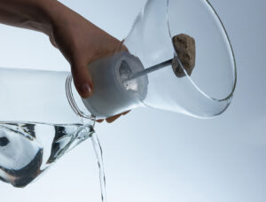 The project combines a simple, low-tech filtration system with a symbolic material element: a dolomite stone integrated into the puller used to remove the filter. This stone naturally remineralizes the water while referencing the geological processes through which water is purified in nature.