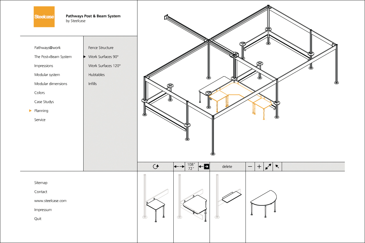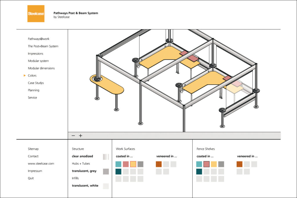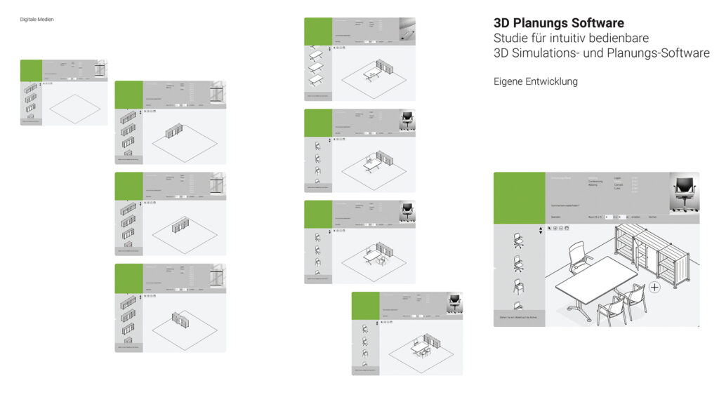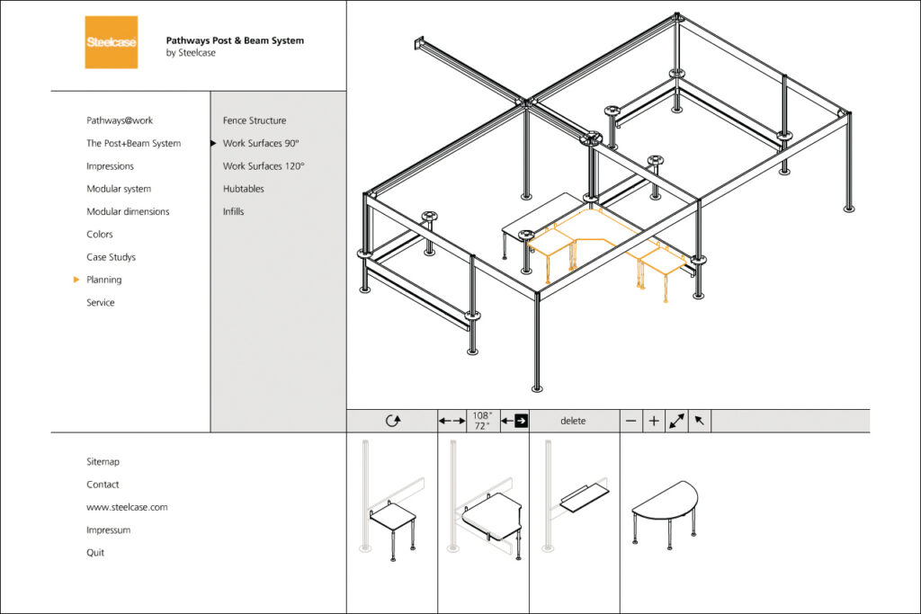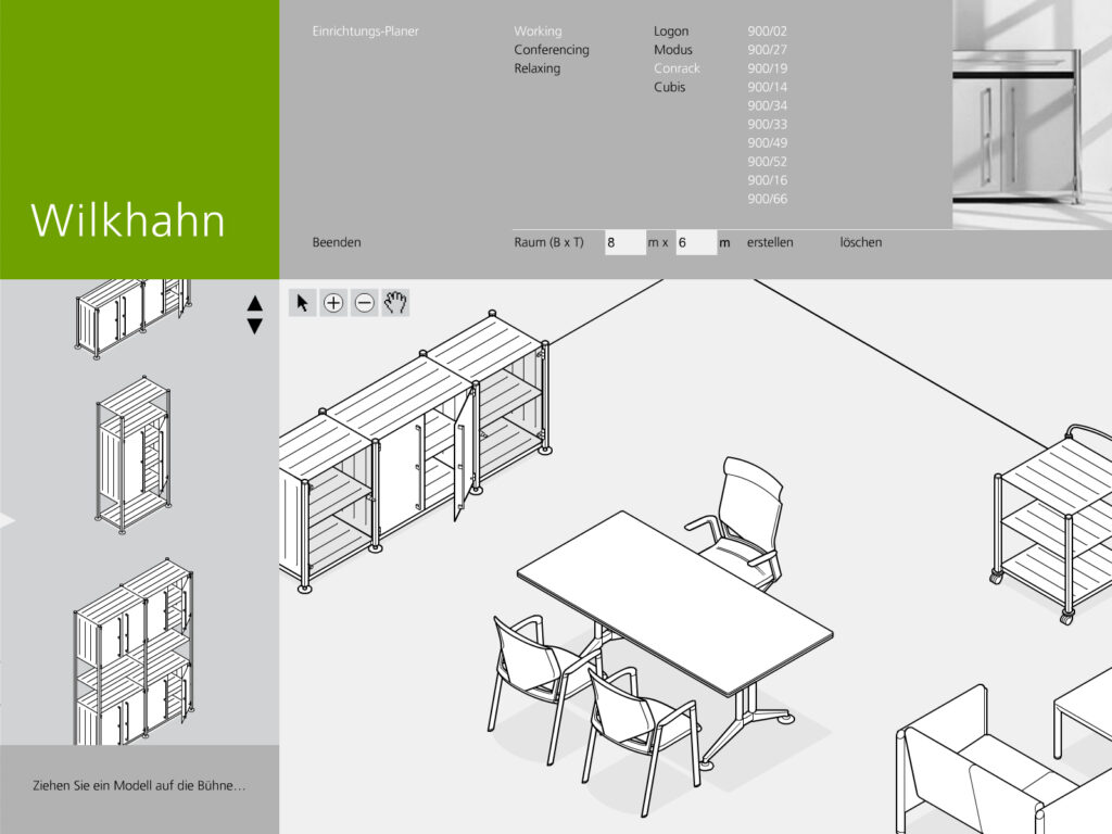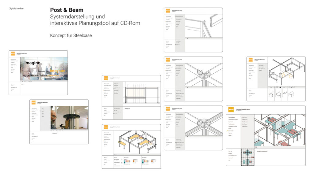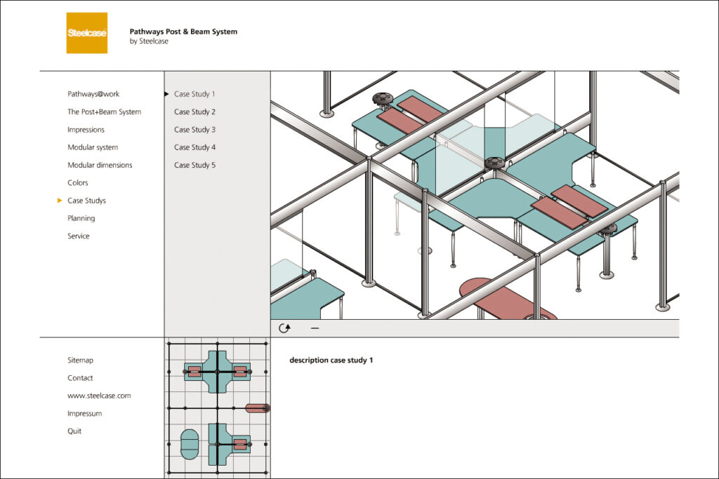Darstellung der systematischen und funktionalen Zusammenhänge eines Raumstruktursystems mit integrierten Kabelführungen, Tischen und Wandelementen. Neben der Systemdarstellung enthält die Software ein interaktives Planungstool, in dem verschiedene Probeaufbauten simuliert werden können.