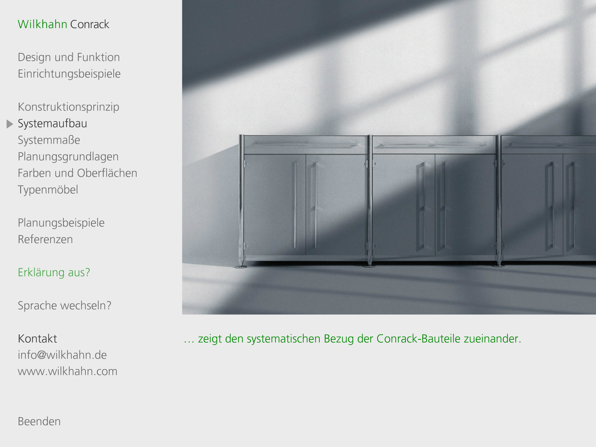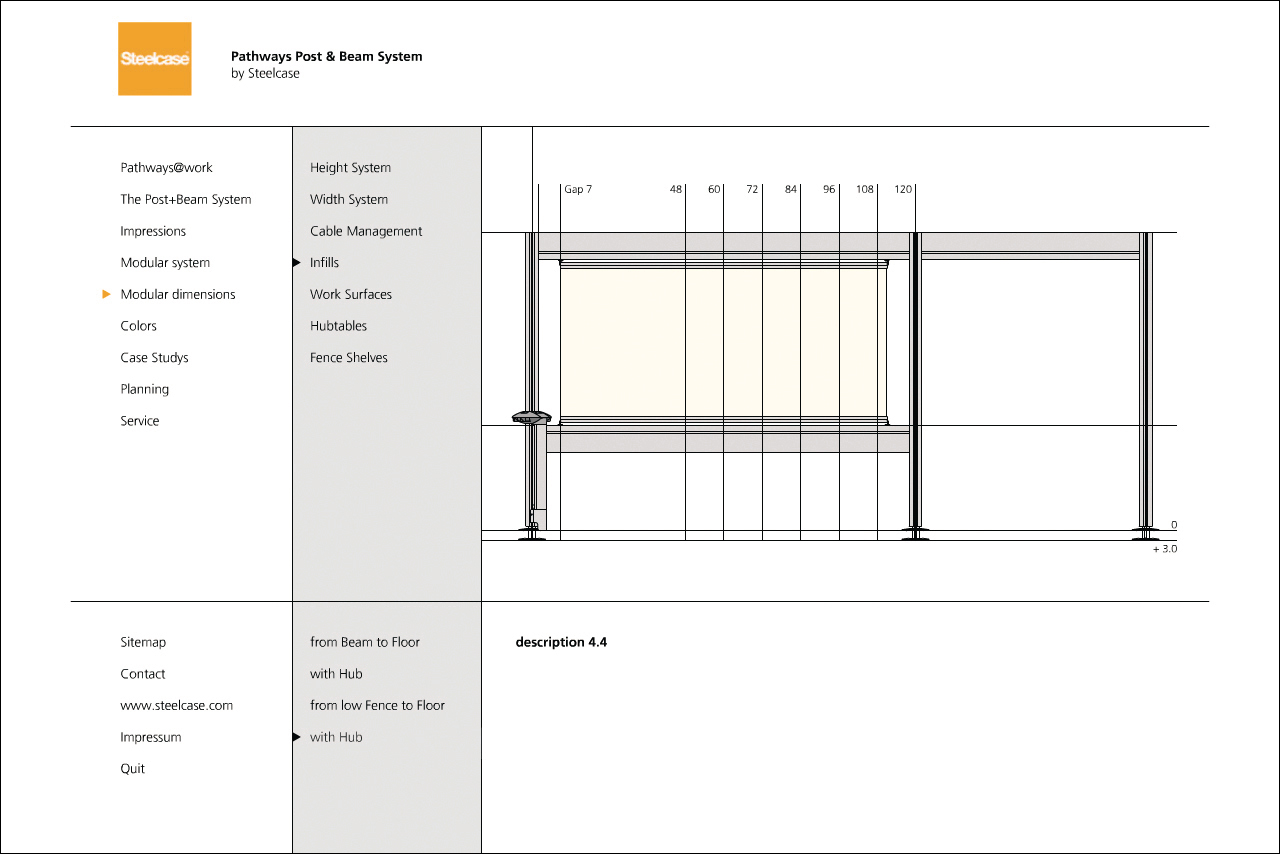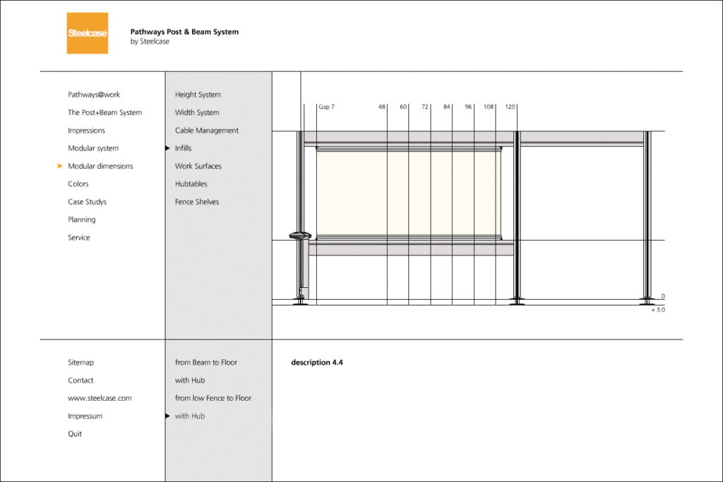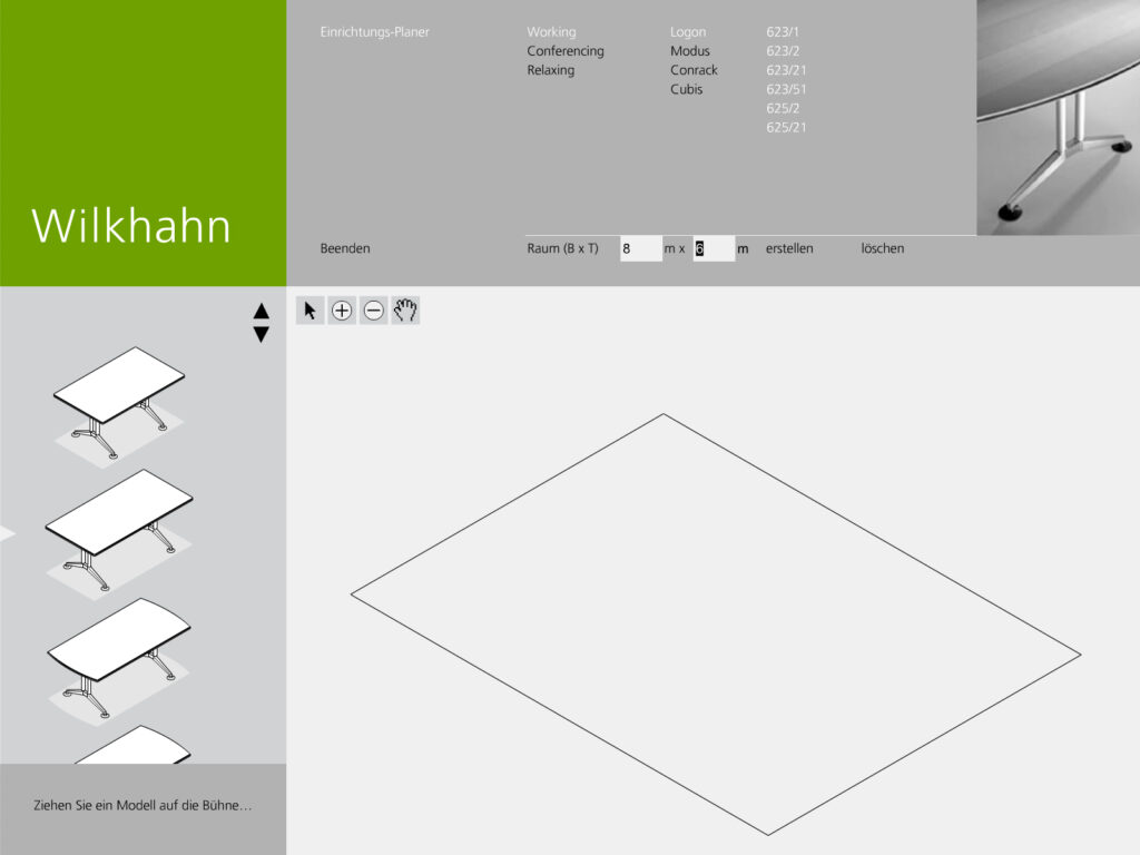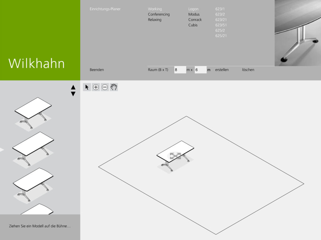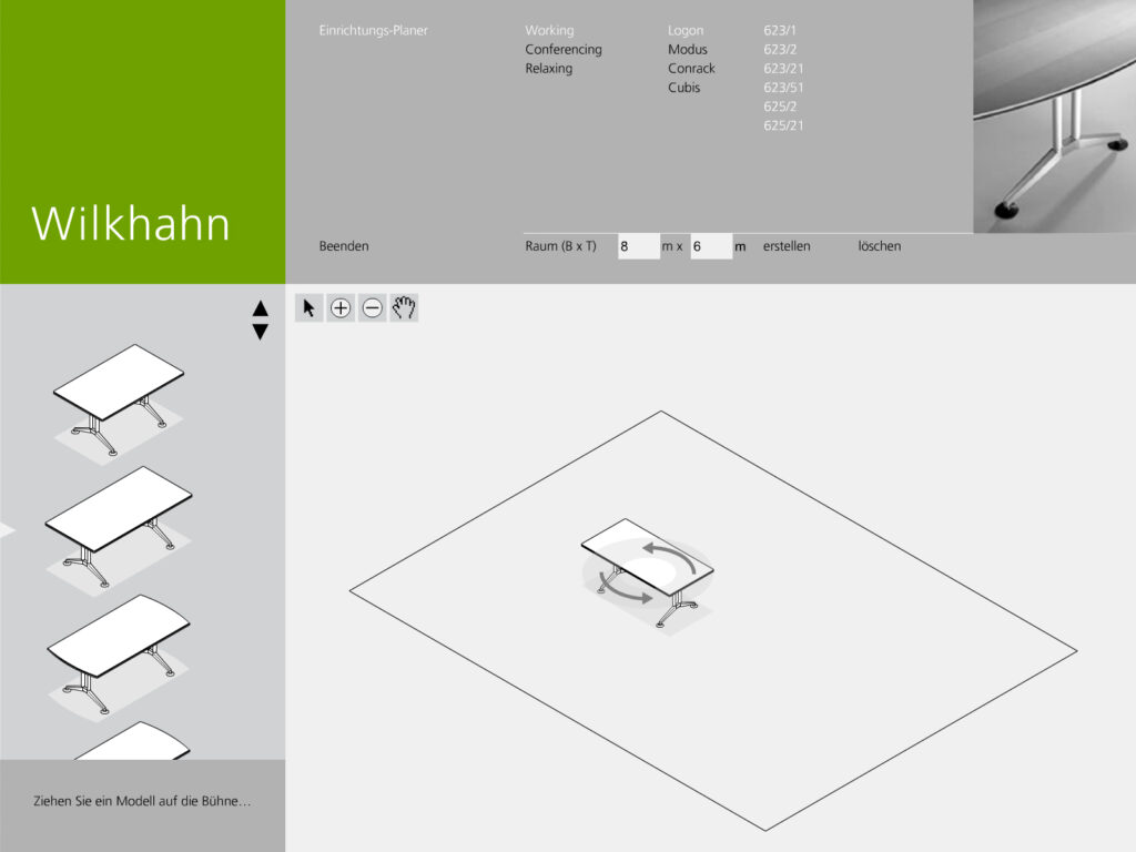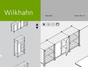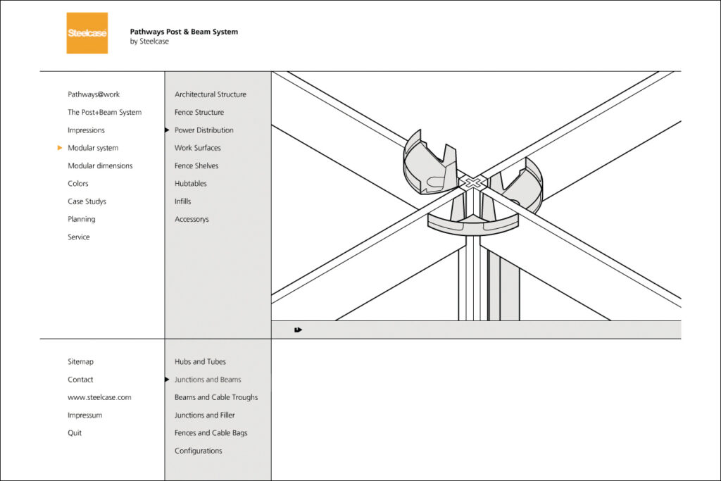 Darstellung der systematischen und funktionalen Zusammenhänge eines Raumstruktursystems mit integrierten Kabelführungen, Tischen und Wandelementen. Neben der Systemdarstellung enthält die Software ein interaktives Planungstool, in dem verschiedene Probeaufbauten simuliert werden können.