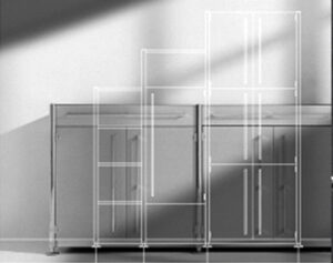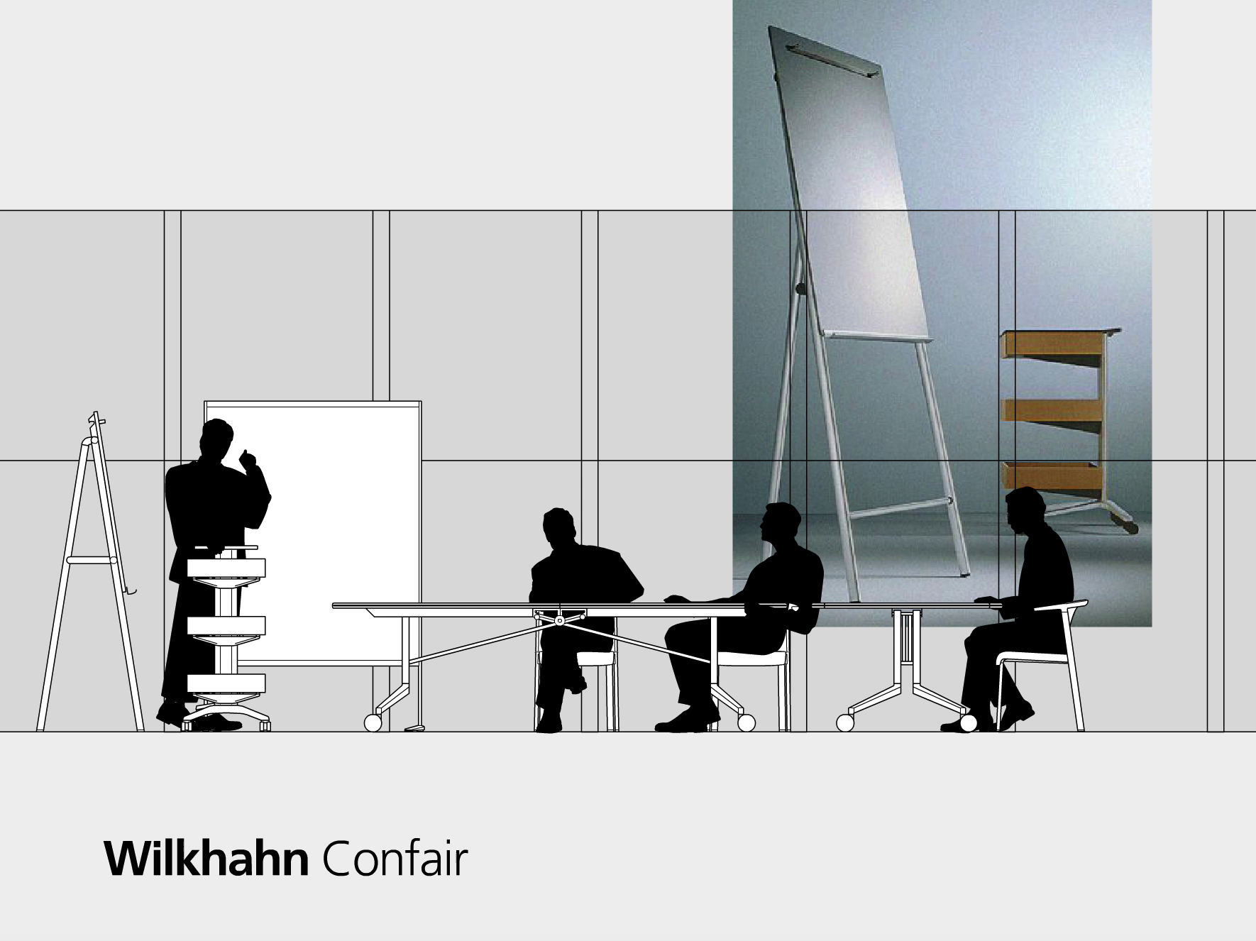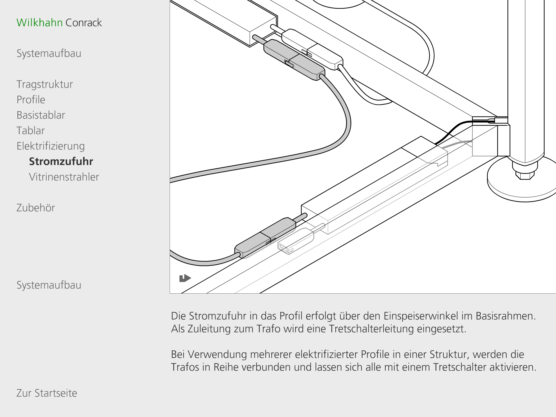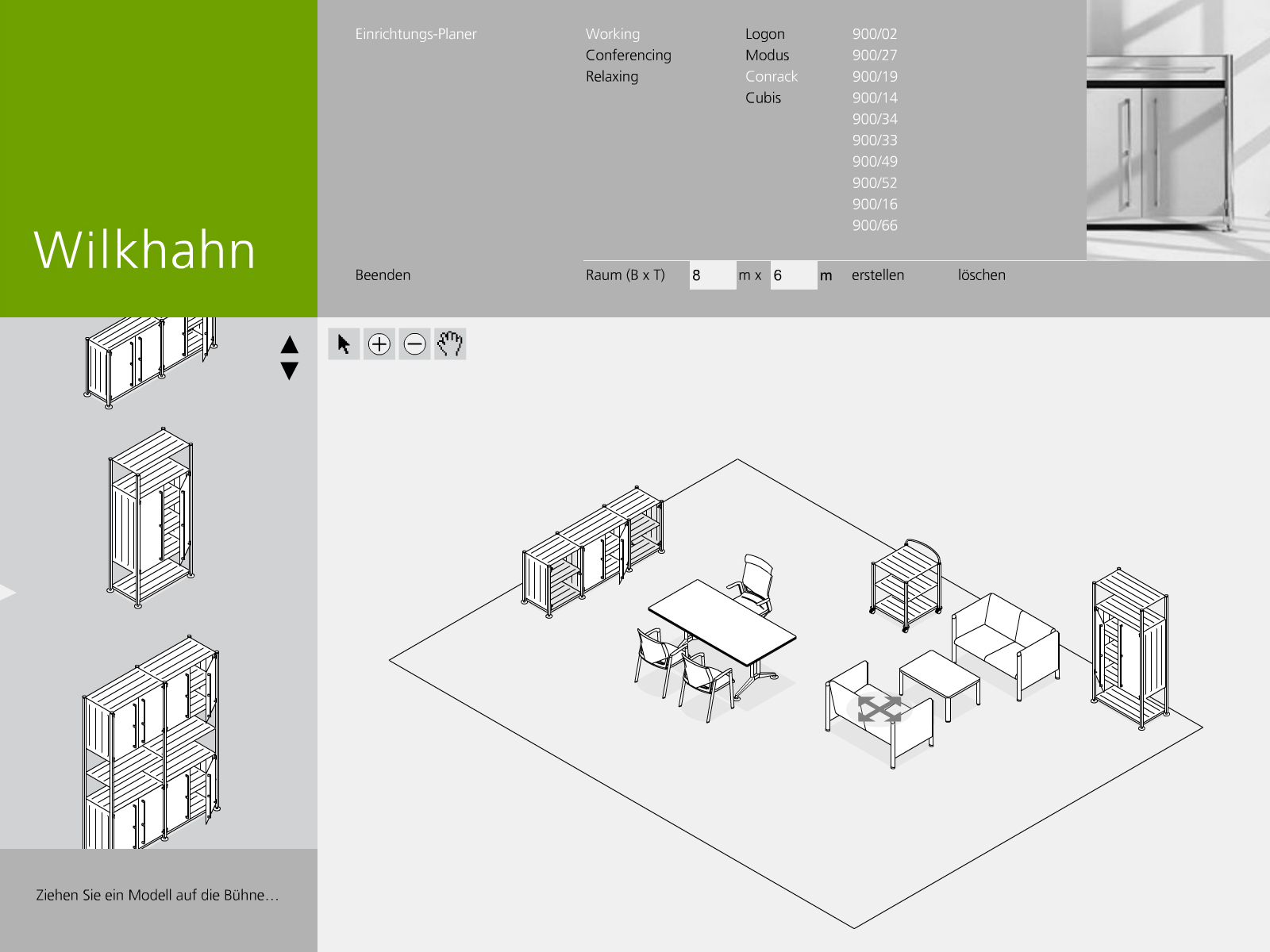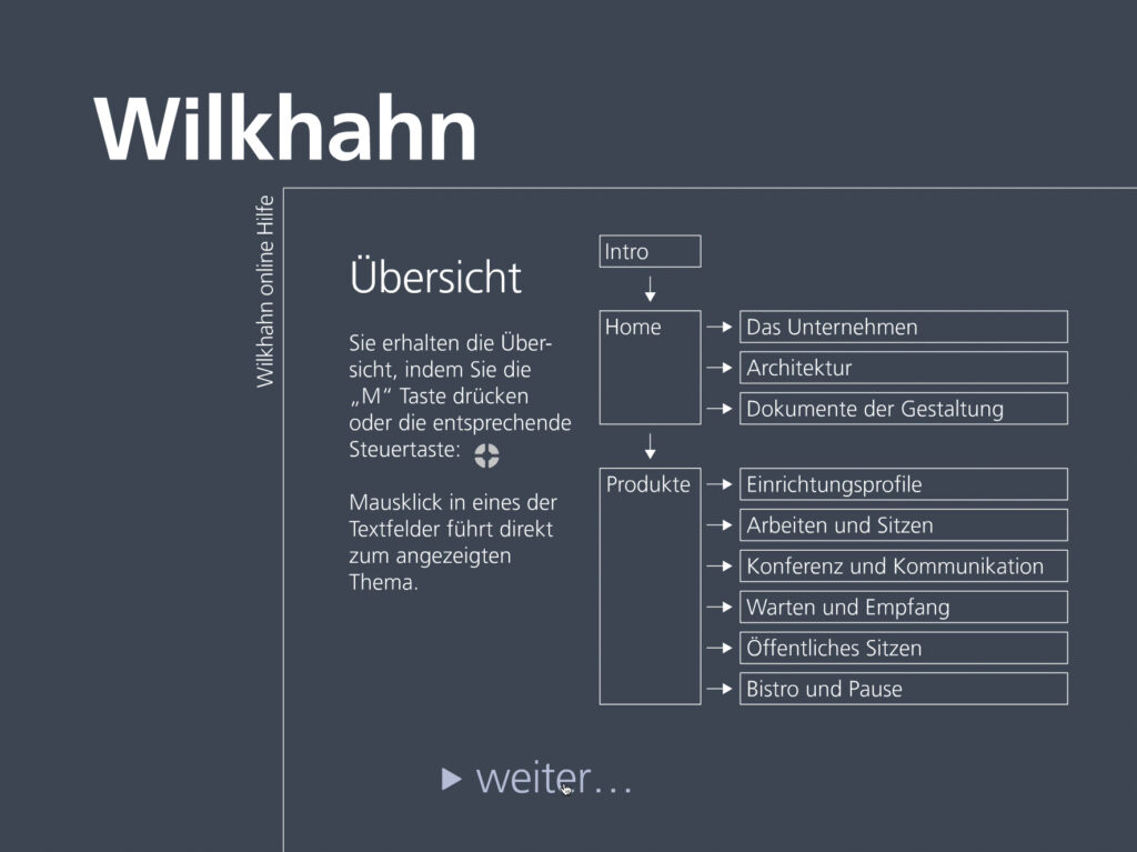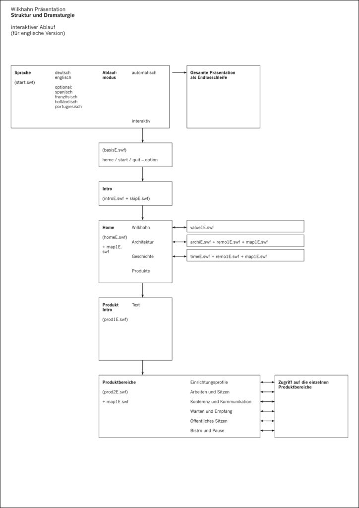 Darstellung der systematischen und funktionalen Zusammenhänge eines Raumstruktursystems mit integrierten Kabelführungen, Tischen und Wandelementen. Neben der Systemdarstellung enthält die Software ein interaktives Planungstool, in dem verschiedene Probeaufbauten simuliert werden können.