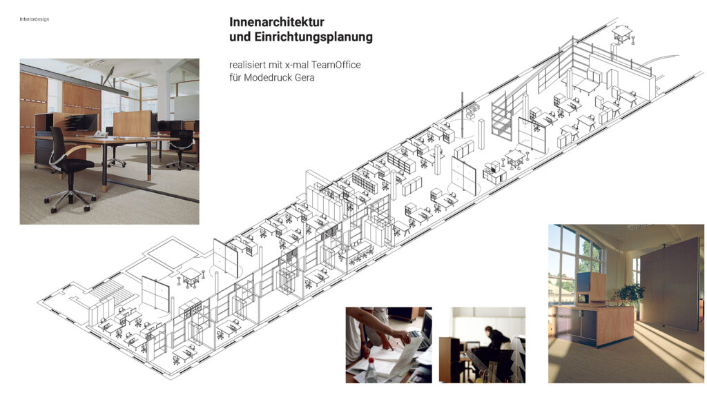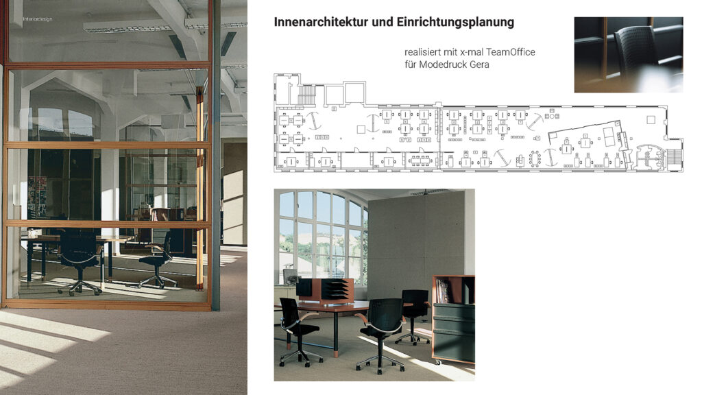 Im Zusammenhang mit umfangreichen Sanierungs- und Neubaumaßnahmen wird für die Verwaltung, den Vertrieb und die Textil-Design-Abteilung eine Etage in einem ehemaligen Produktionsgebäude eingerichtet. Bei dem Gebäude handelt es sich um einen Stahlbetonskelettbau wie sie typischerweise zu Beginn des 20. Jahrhunderts als Industriebauten errichtet wurden. Die zur Verfügung stehende Etage ist bauseitig in zwei große Räume unterteilt. Das angestrebte Konzept einer hohen kommunikativen Vernetzung der verschiedenen Arbeitsgruppen legt eine offene Raumstruktur nahe. Die bauseitigen Bedingungen wie der hohe Fensteranteil, gute Lichtverhältnisse – auch in der Mitte des Raumes – kommen diesen Planungsvorhaben entgegen.