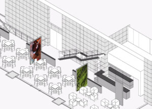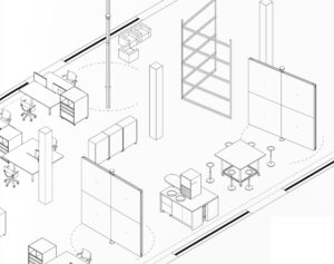Tische, Container und raumhohe Drehwände werden für die Einrichtung eingesetzt,