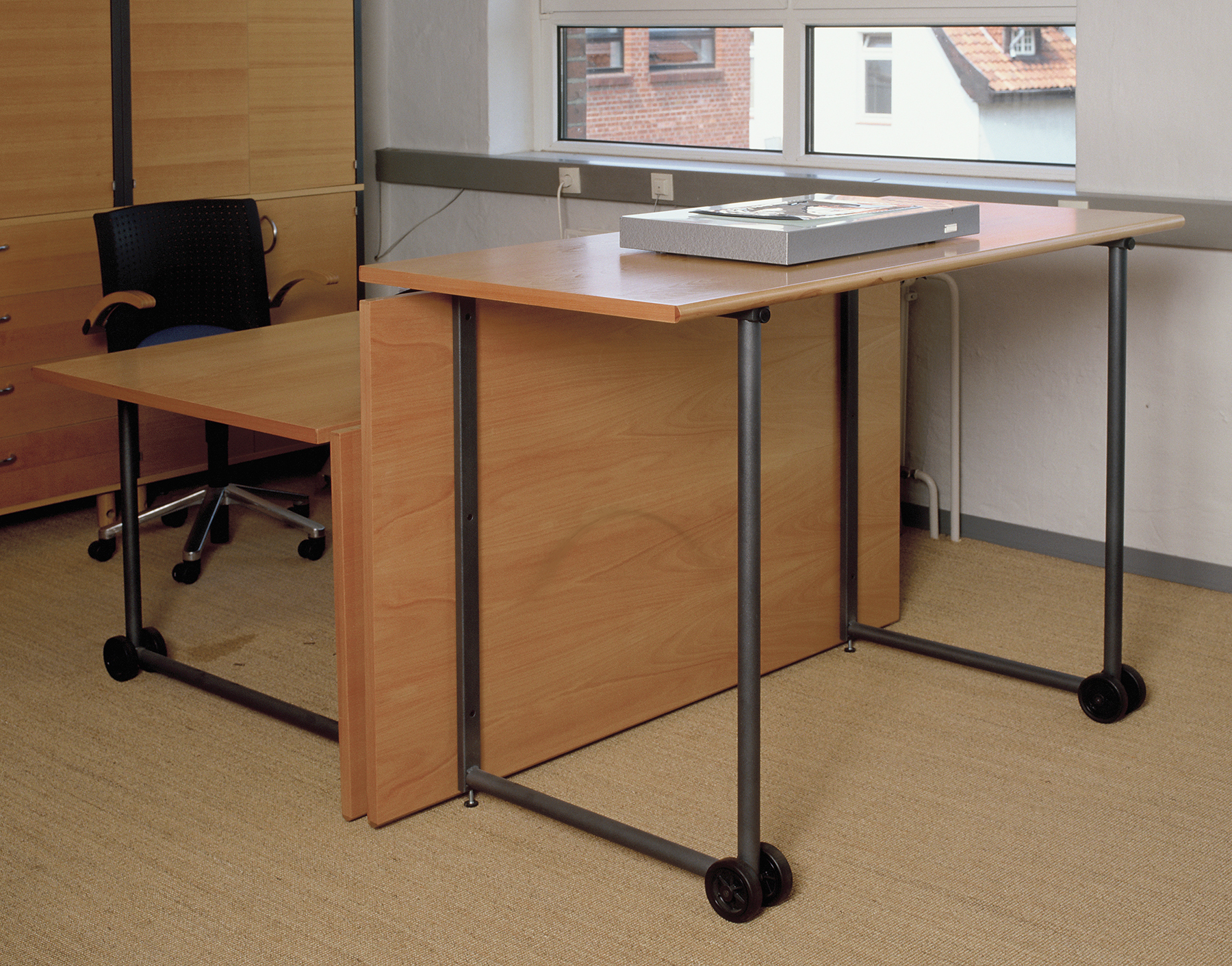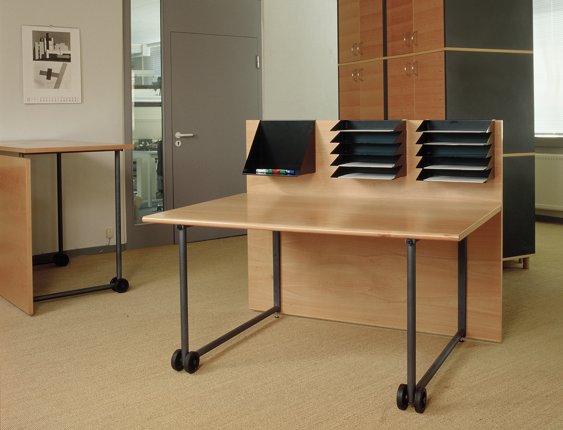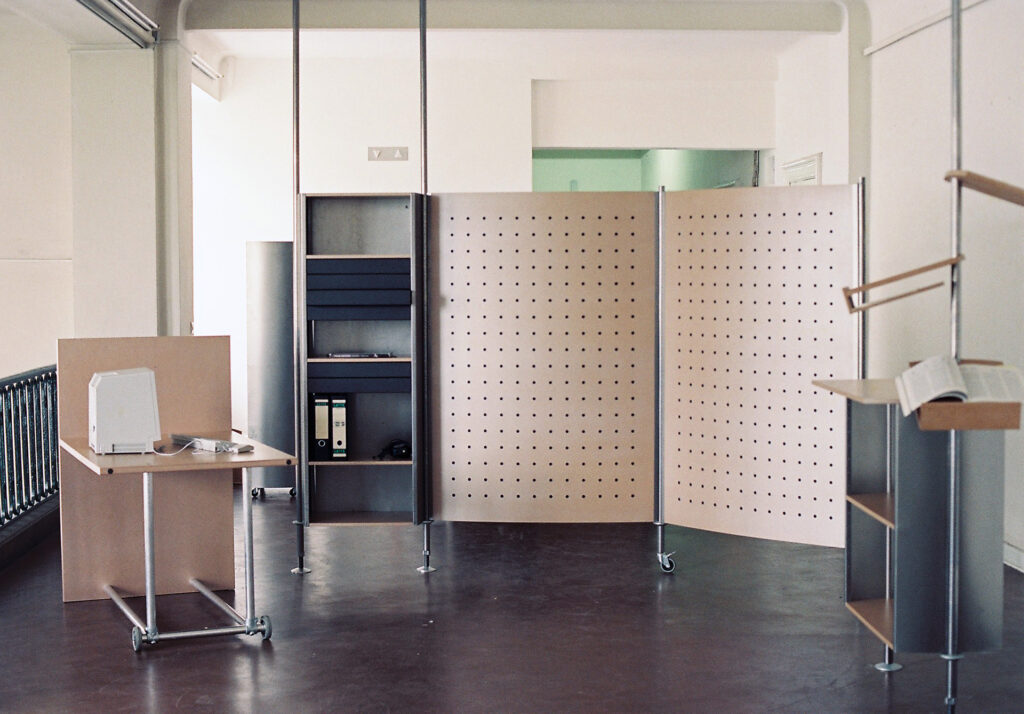 Für die Arbeitsplätze wurden Tische eingesetzt, die sich sowohl für die Arbeit im Sitzen als auch im Stehen eignen. Der Tisch mit zwei rechtwinklig zueinander stehenden Flächen läßt sich um 90° drehen, so ergeben sich Positionen für Sitz- und Stehhöhe. Die hier gezeigte Variante bietet in der Sitzposition eine rückwärtige Blende, an der unterschiedliche Organisations- Elemente angehängt werden können.