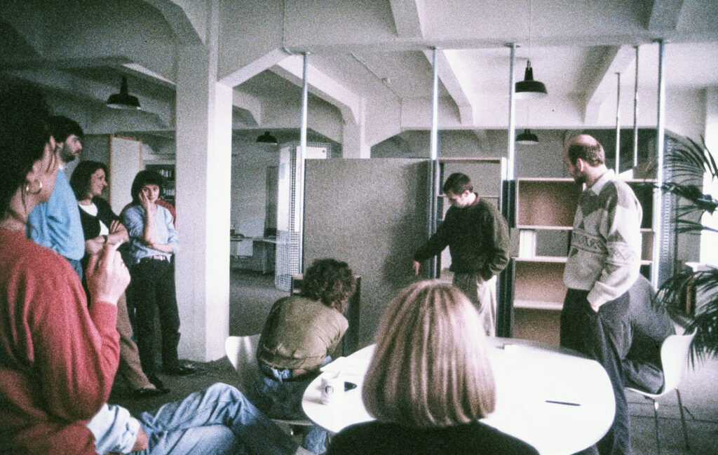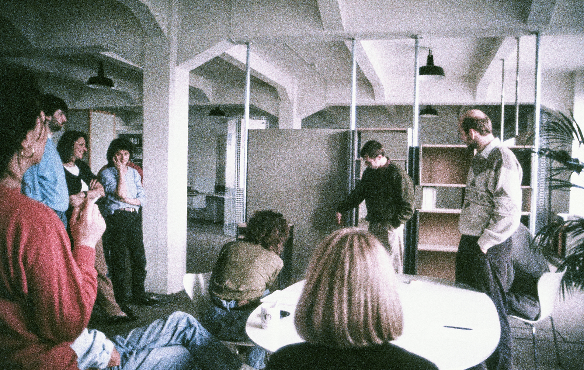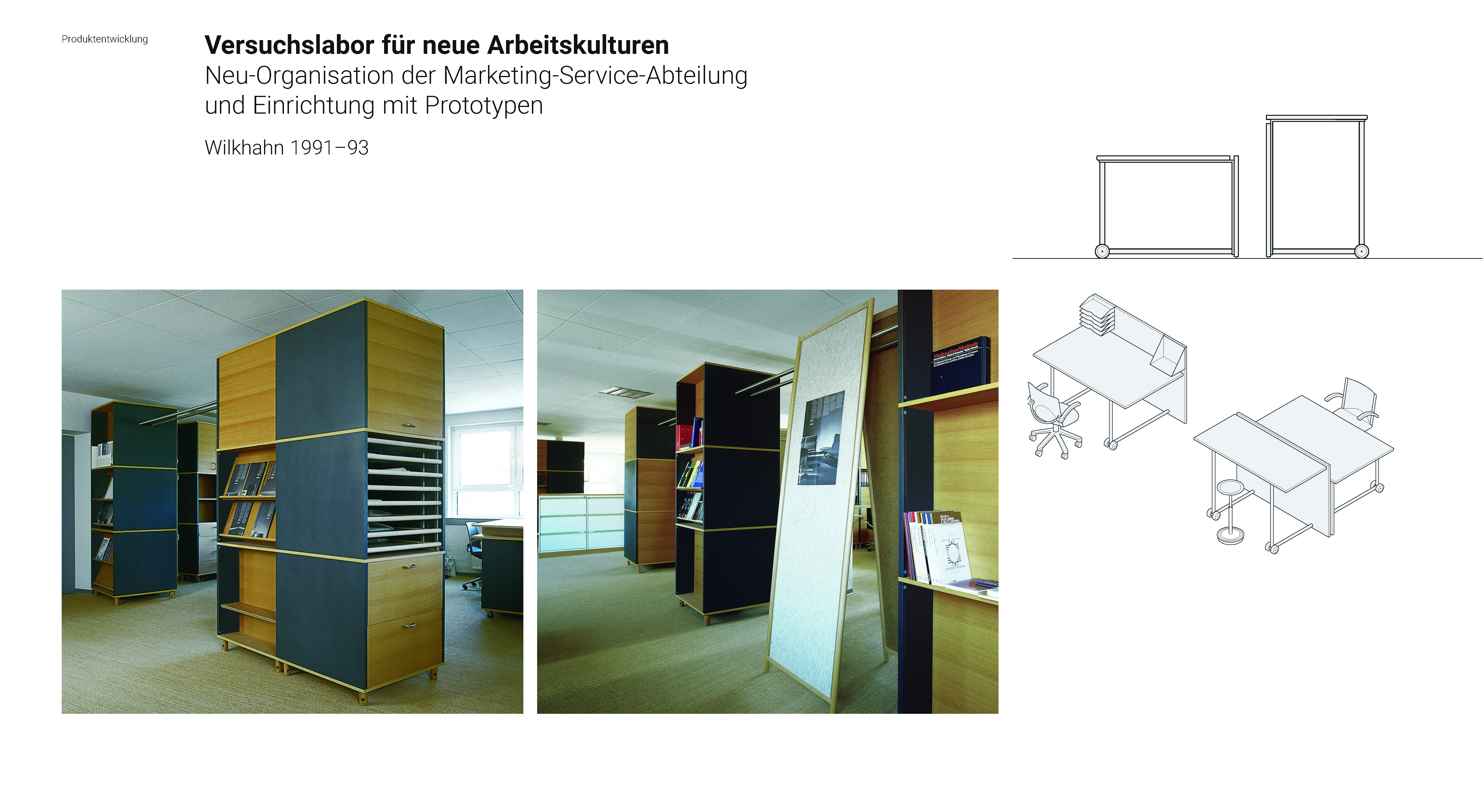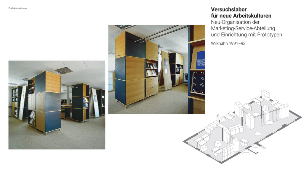 1991 beginnen wir mit der Abteilung „Marketing- Service“ bei Wilkhahn ein Projekt, das nicht nur nach neuen Ansätzen für die Büro-Einrichtung sucht, sondern den Zusammenhang zwischen Einrichtung und Organisationsformen, Arbeits- mitteln und -techniken, Kommunikation und räum- lichen Bedingungen für Gruppenarbeit erkunden will.