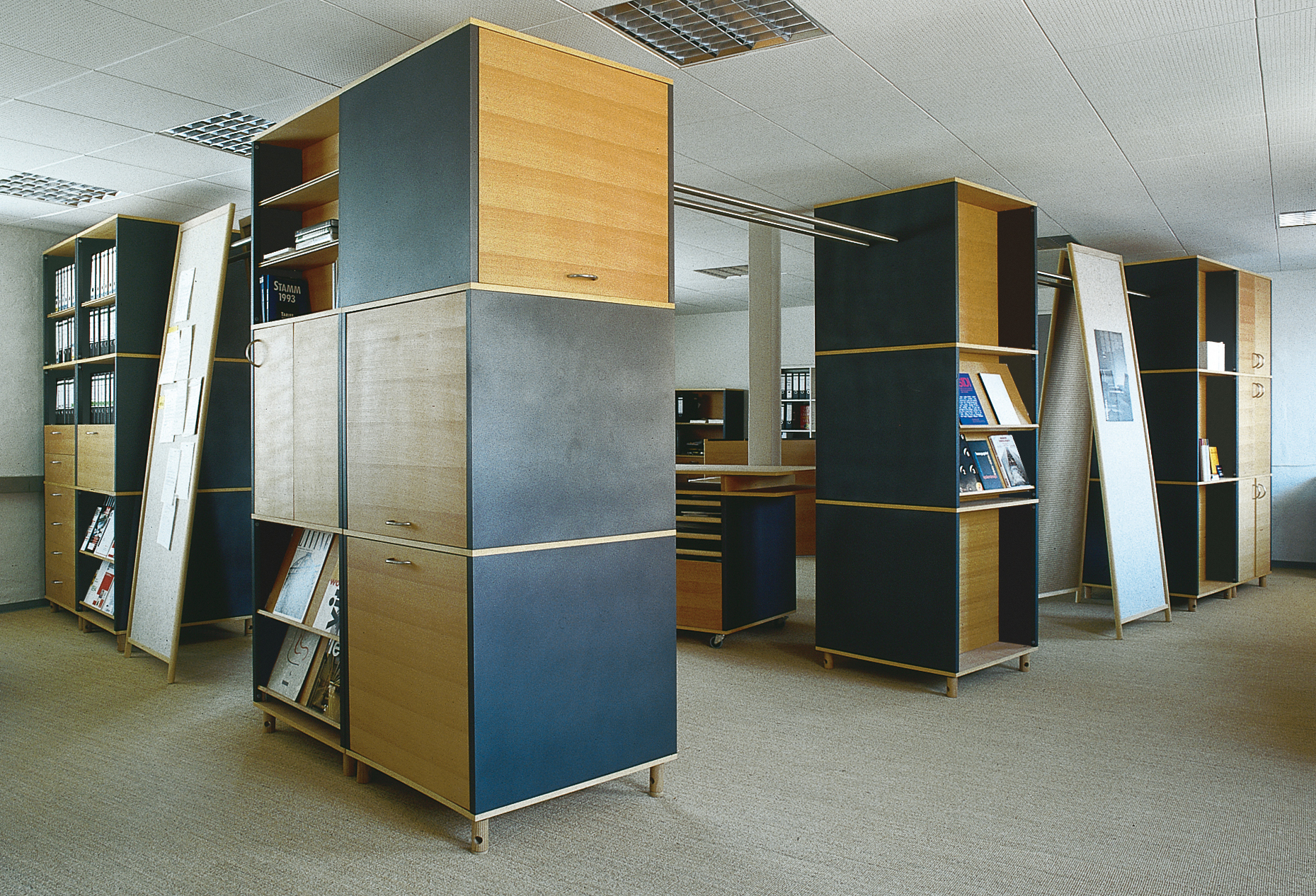 Im Büro-Alltag gibt es selten Arbeiten, die in festgelegtem Zeitrahmen ablaufen. Häufiger sind Arbeiten „nicht-linear”: Sie werden von anderen Tätigkeiten unterbrochen, verschiedene Projekte entwickeln sich parallel. Für diese Art von Arbeit ist eine Einrichtung sinnvoll, in der Zwischenstadien fixiert werden können und die zugleich Platz bietet für parallel laufende Projekte. Normale Arbeitsflächen im Büro sind schon grössenmässig kaum in der Lage den notwendigen Organisationsraum zu bieten. Ein sinnvoller Weg ist die vertikale Organisation – hier verwirklicht durch Display-Ablagen in den „Türmen“ und vorallem durch Pinnwände.