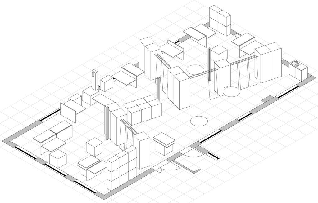 Die frei im Raum positionierbaren Turm-Container werden aus kubischen Modulen durch Übereinanderstapeln gebildet. Im Sinne des Versuchslabors werden diese Module mit unterschiedlichen Organisations-Elementen ausgestattet.