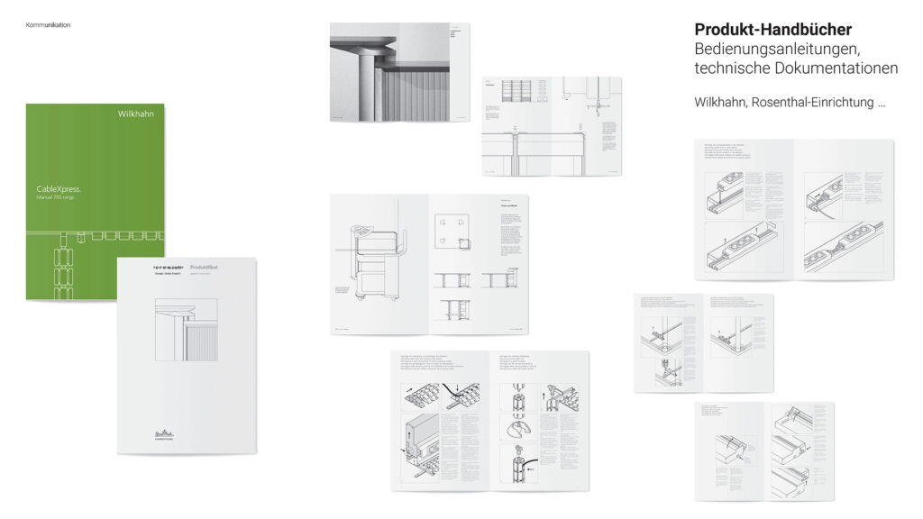Auf mehr als hundert Seiten soll das Planungs-Handbuch für das Büromöbel-Programm crew.com Eigenschaften und Details der Möbelprodukte beschreiben und Einrichtungslösungen in prinzipiellen Zeichnungen und exemplarischen Fotografien darstellen.