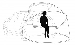 „Allein zu Zweit“ ist das Konzept der cabin 4 2. Sie ist ein Ort, besser ein Plätzchen, der ungestörte Privatheit, Entgrenzung und einen Funken Romantik verspricht. Ob die cabin 4 2 nun im Garten oder auf der Dachterrasse steht … befindet man sich erst einmal drin, ist alles andere ausgeblendet. Nur der Himmel zieht über einen hinweg, wenn das Dach geöffnet ist. Muss das Dach wegen schlechtem Wetter geschlossen beiben, ist ein Fenster an der Stirnseite der letzte Bezug zur Außenwelt. Der zweieinhalb Meter lange Innenraum mit fünfeckigem Querschnitt ermöglicht verschiedene Sitz- und Liegepositionen und bietet genug Stau- und Bewegungsraum, um ein ganzes Wochenende darin verbringen zu können.