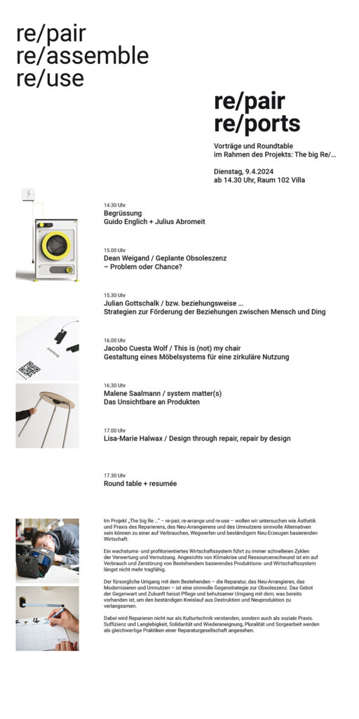 Im Projekt „The big Re …” – re-pair, re-arrange und re-use – wollen wir untersuchen wie Ästhetik und Praxis des Reparierens, des Neu-Arrangierens und des Umnutzens sinnvolle Alternativen sein können zu einer auf Verbrauchen, Wegwerfen und beständigem Neu-Erzeugen basierenden Wirtschaft.