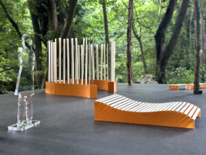 Durch die Ausrichtung der Sitzgelegenheiten wird der Blick gezielt gelenkt. So entstehen Irritationen, die vertraute Bilder aufbrechen und neue Perspektiven auf den Wald eröffnen.